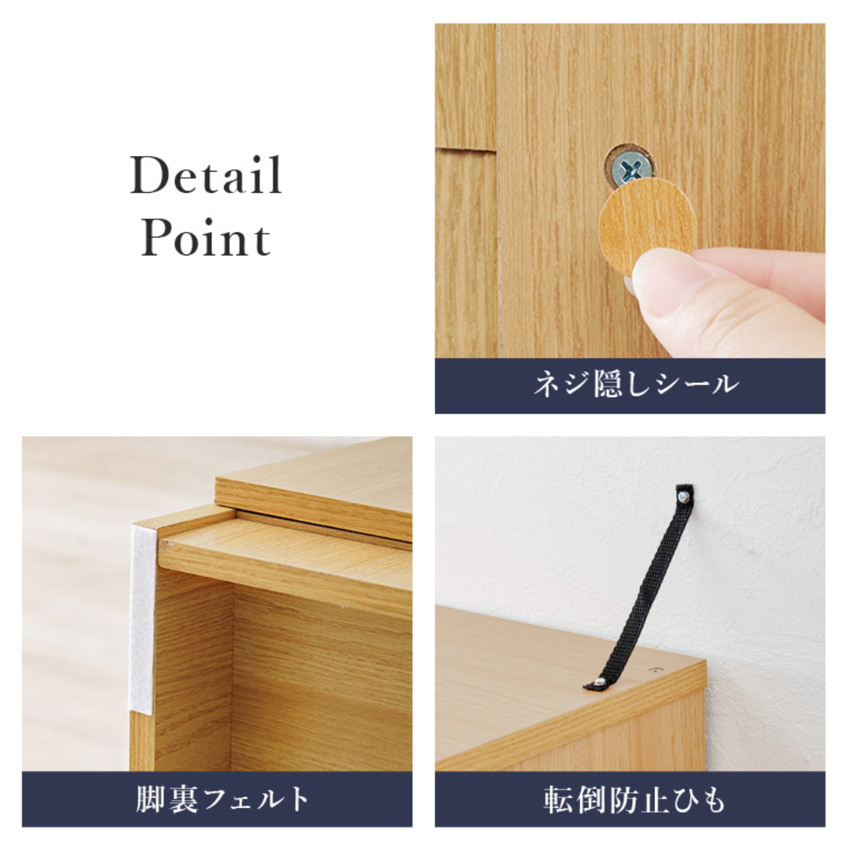 ネジが見えて不格好にならないためのネジ隠しシール、床をキズ付けないための脚裏フェルト、万が一の際の転倒を防ぐ転倒防止ひもが付属しています。