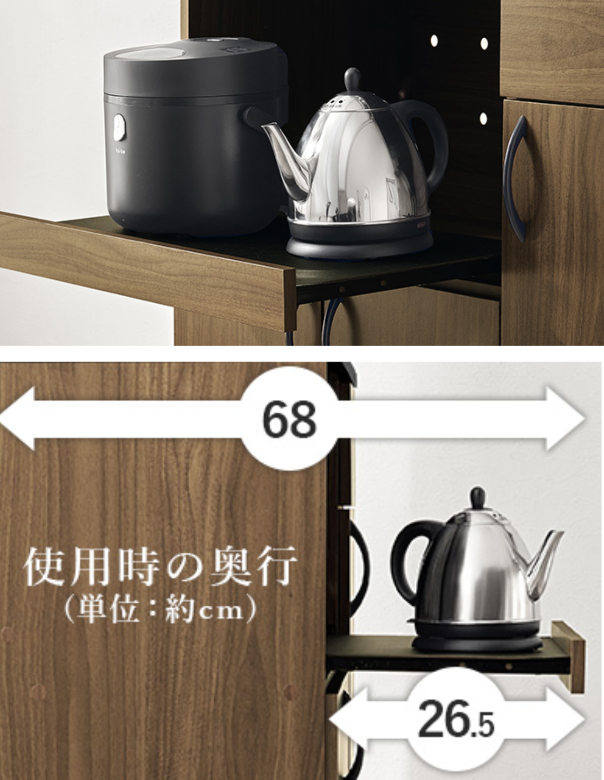 スライドレール付きで、ケトルや炊飯器等の蒸気が出る家電を置いてもスムーズに出し入れできます。
