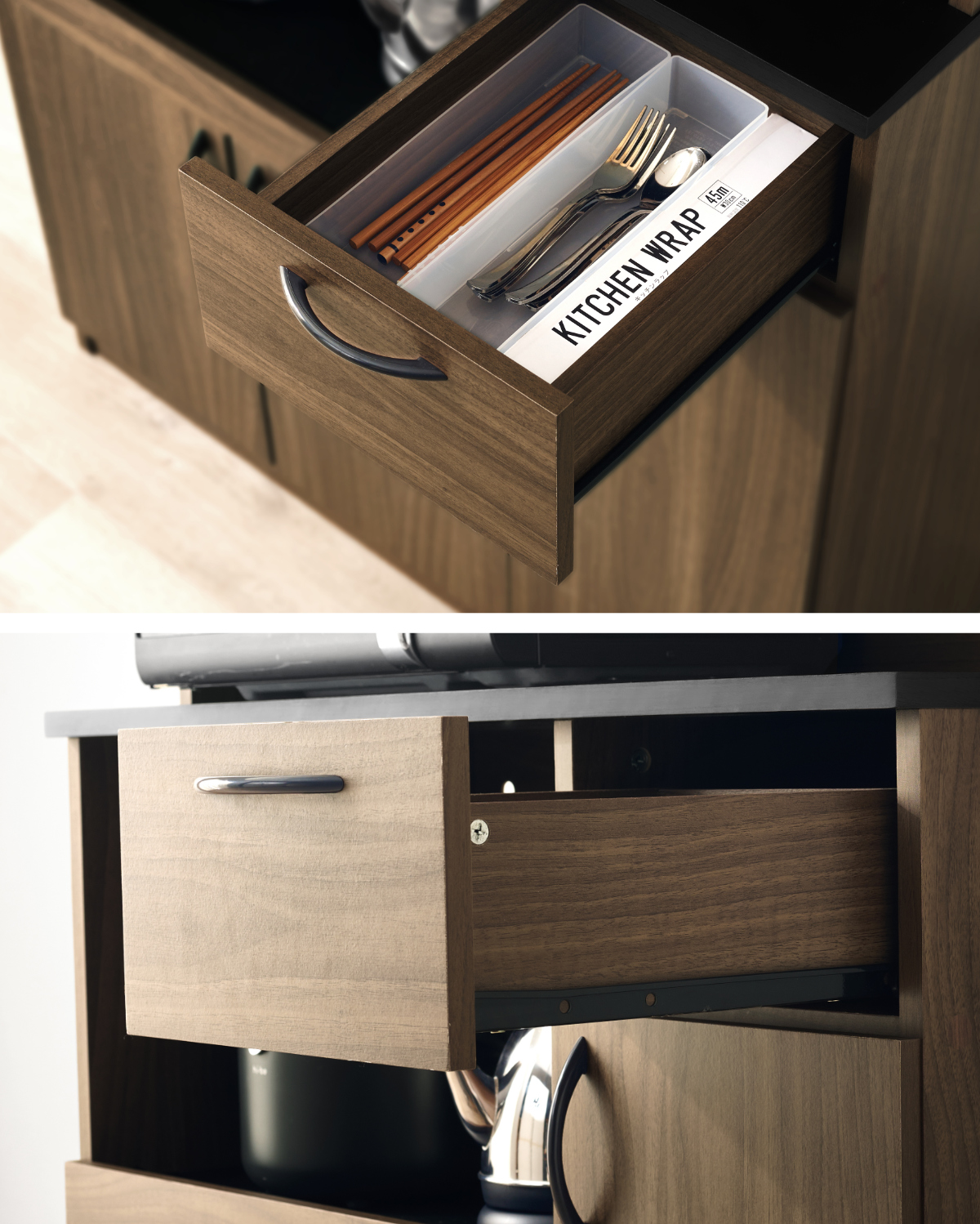 カトラリーや布巾などの小物を整理できる引出し収納があります。スライドレール仕様なので、開閉がスムーズにできます。