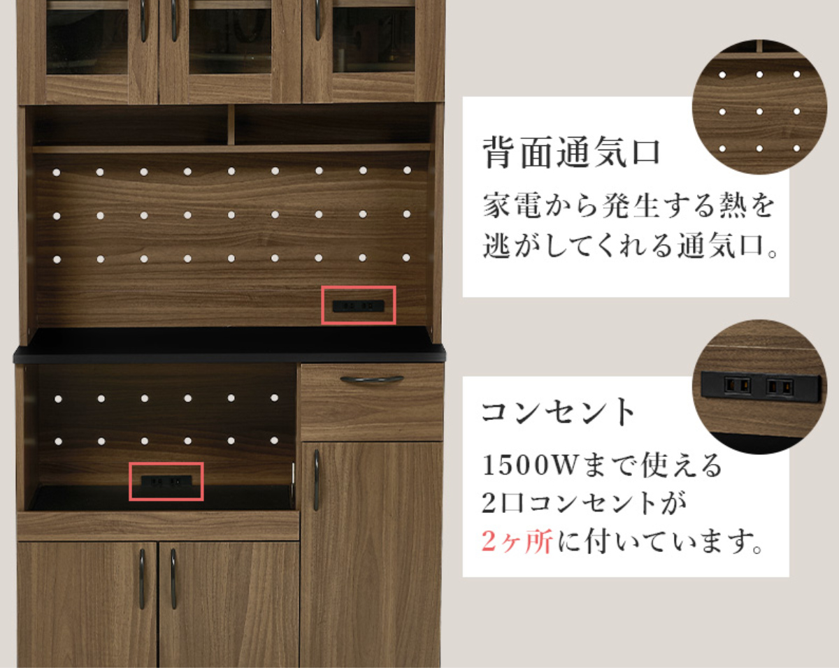 オープンスペースとスライド収納の背面には、熱を逃がしてくれる通気口と、1500Wまで対応した2口コンセントが設置されています。