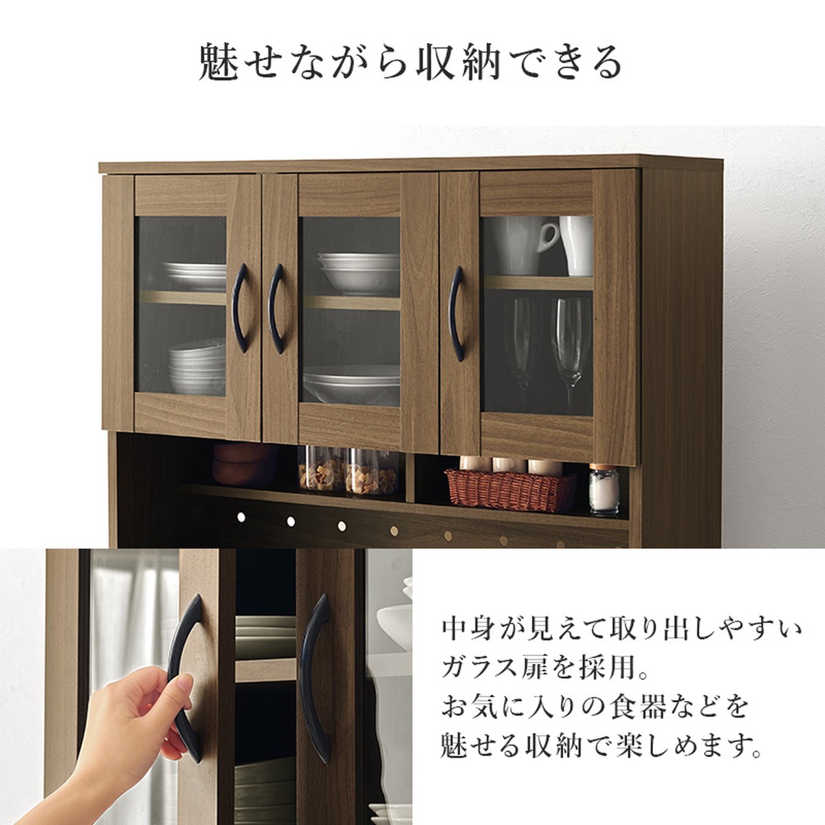 上段の扉収納は、中身が見えるガラス扉を採用。上段下にはディスプレイ棚もあり、お気に入りの食器や雑貨等のディスプレイも楽しめます。棚板は、収納したい物に合わせて高さを調節できる可動式です。