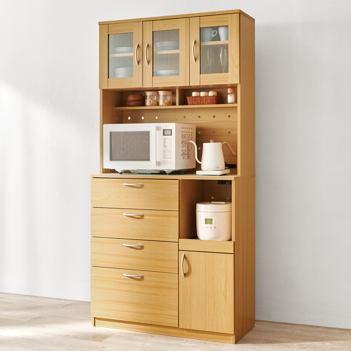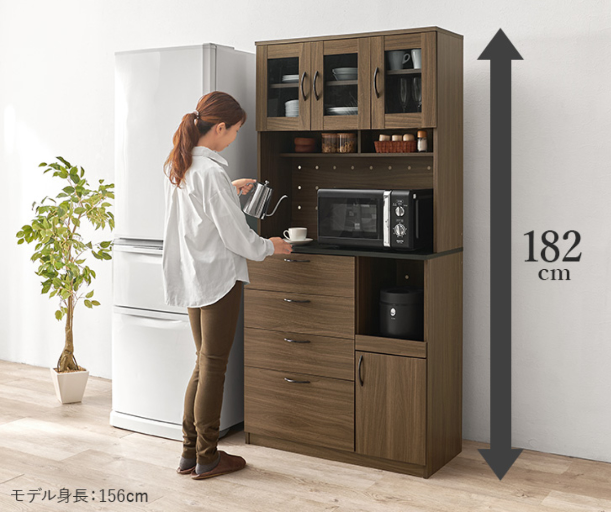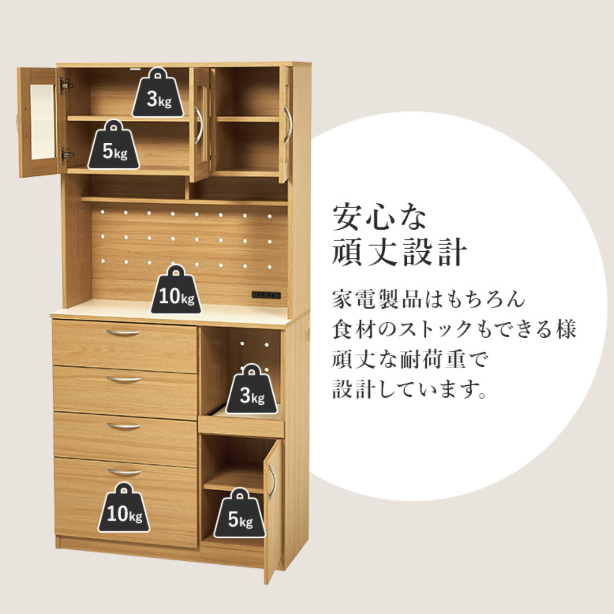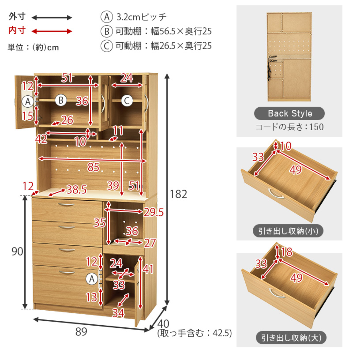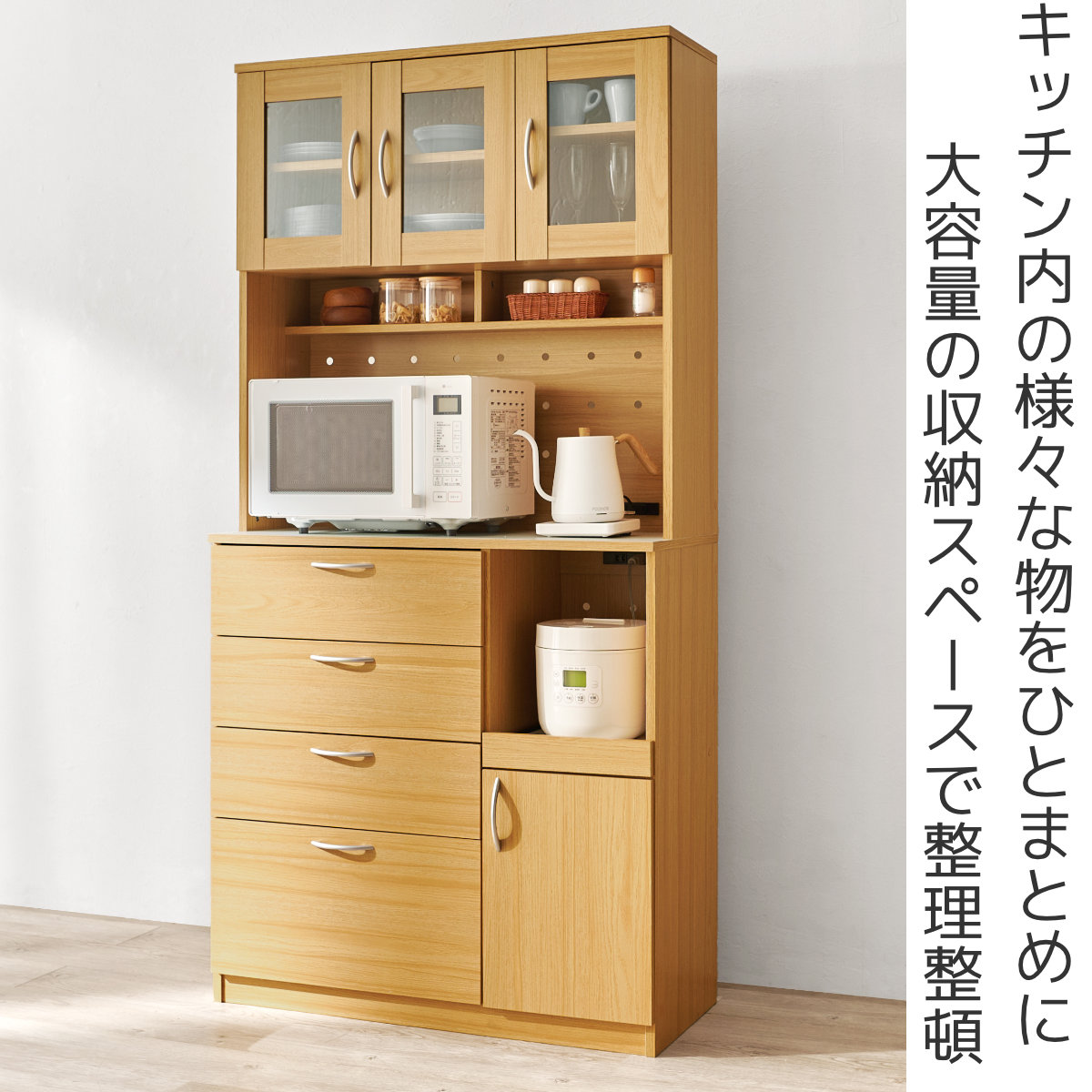 収納スペースが豊富で家電も食器もまとめて収納できる大容量タイプのキッチンボードです。引出しやスライド収納、大きさの違う扉収納などの機能がたくさん。幅89cm高さ182cmのたっぷりサイズで、キッチンがスッキリと片付きます。