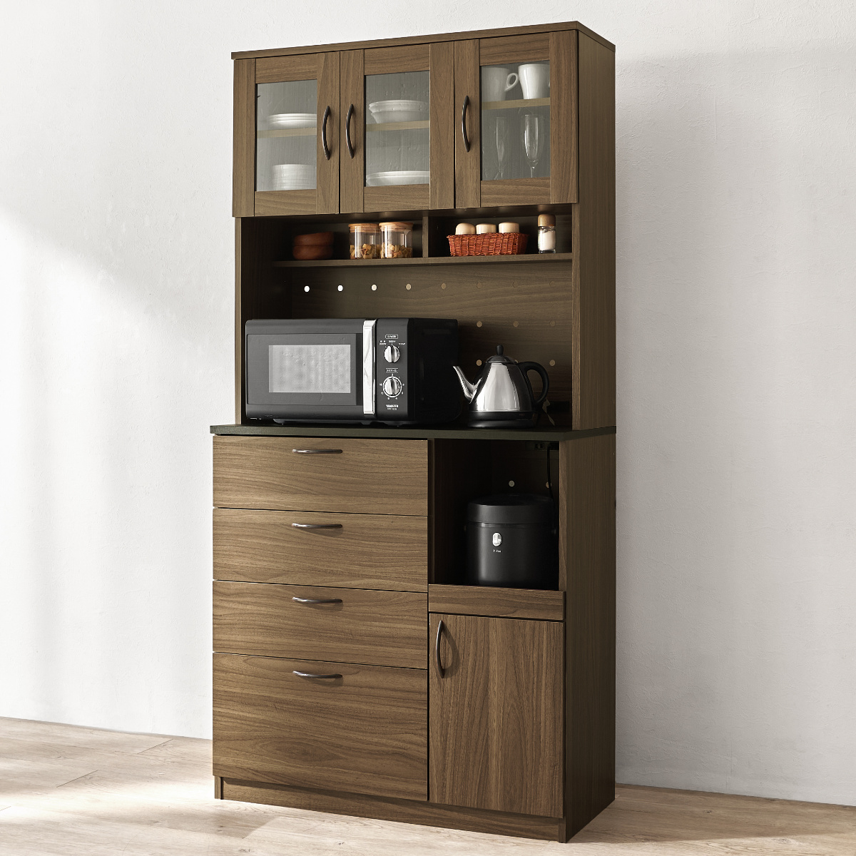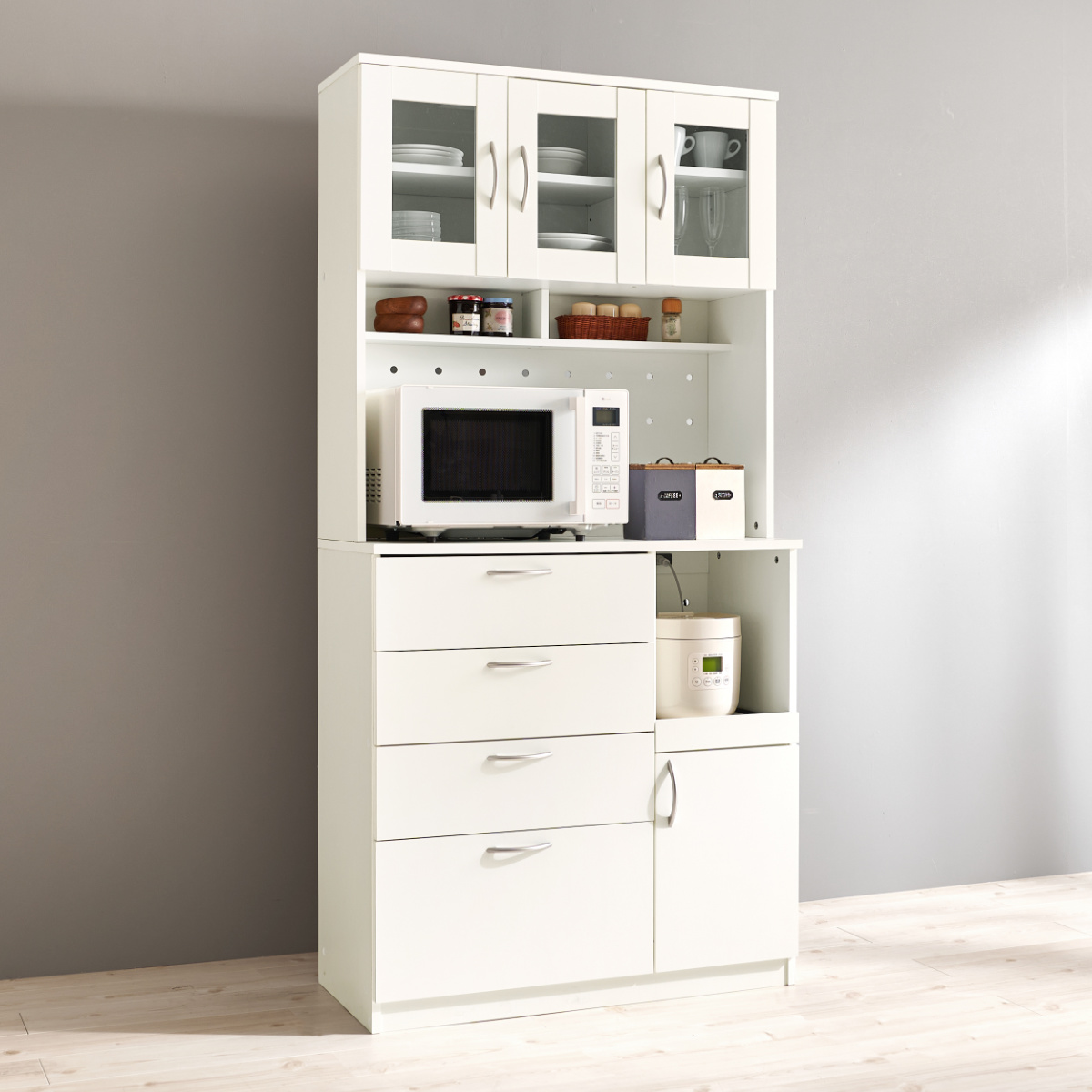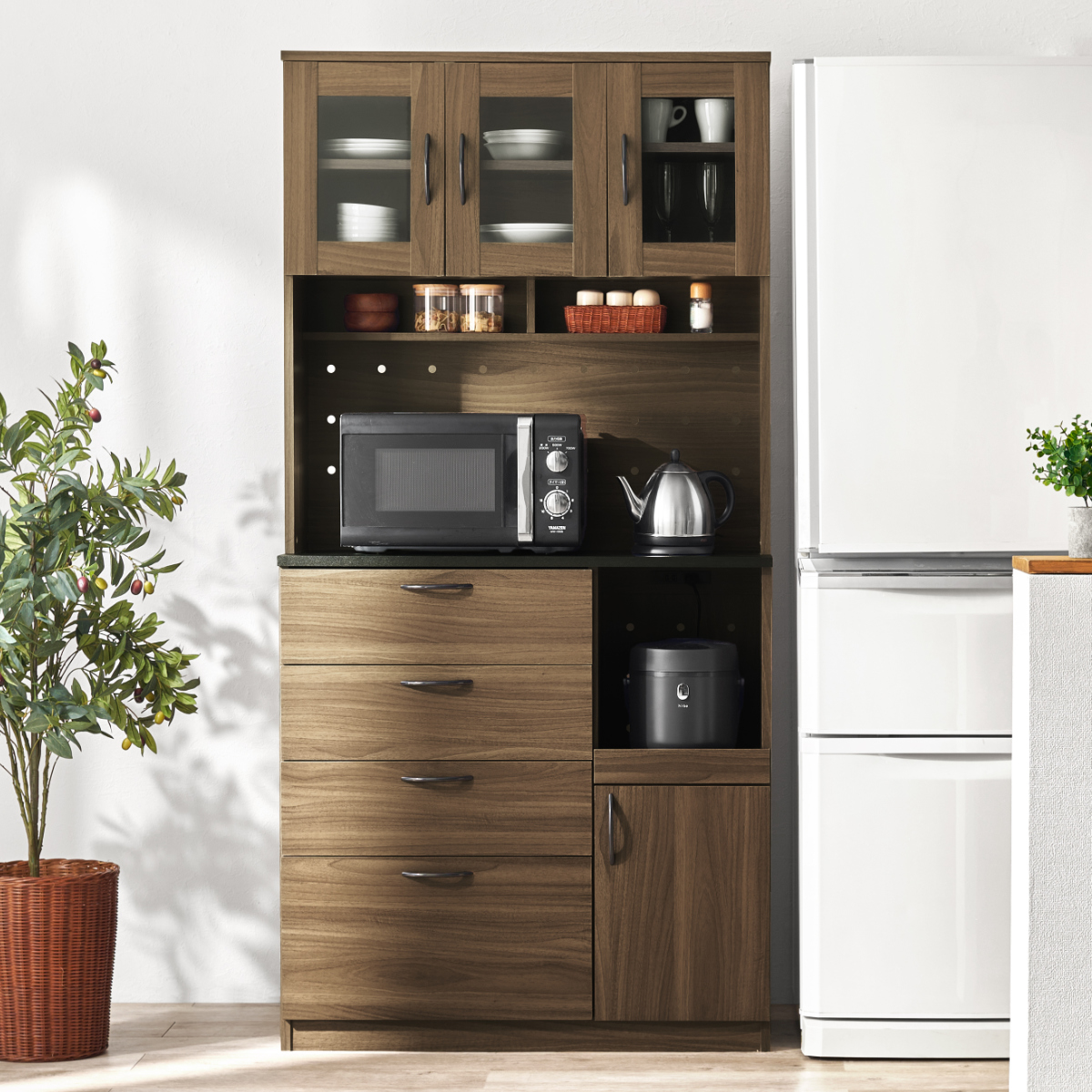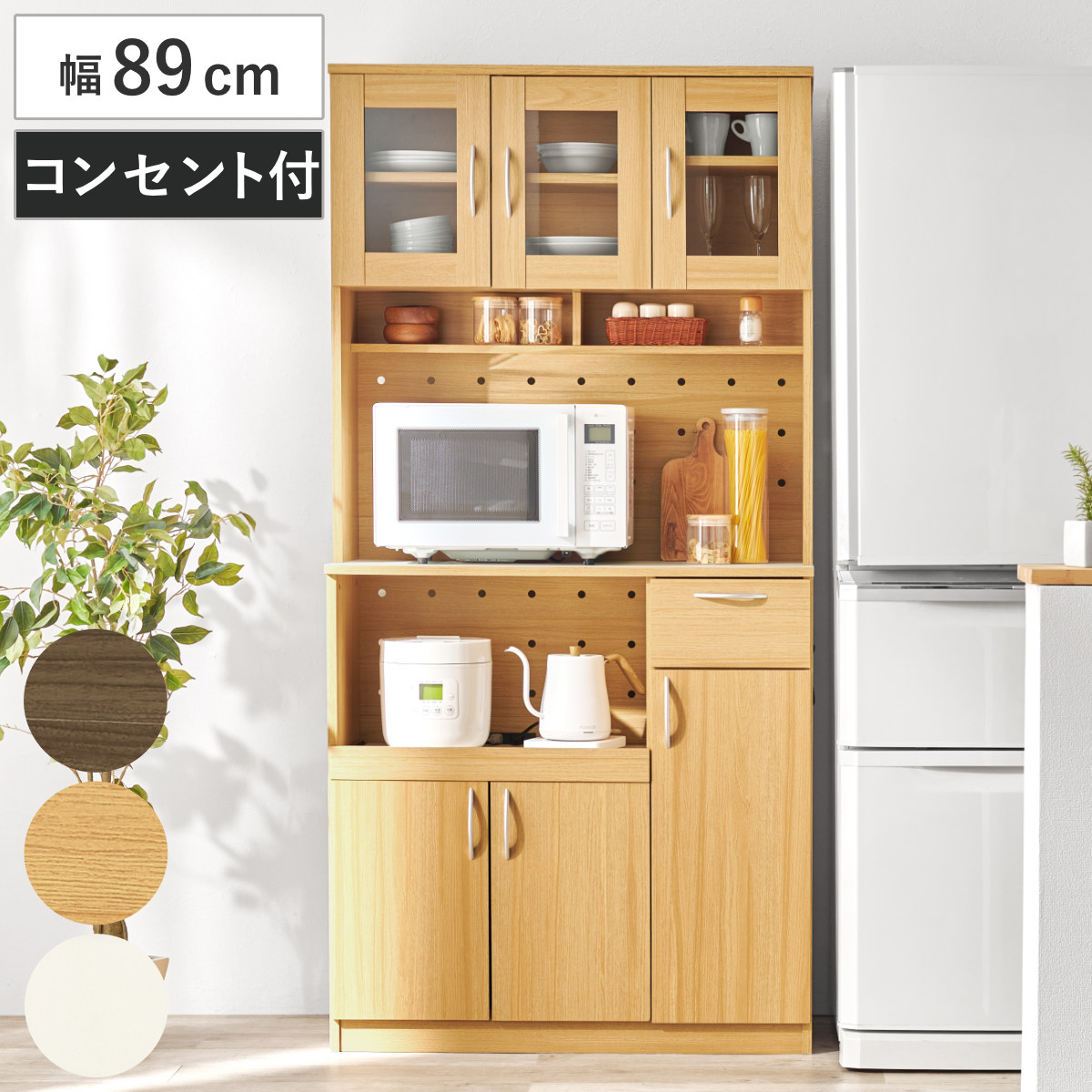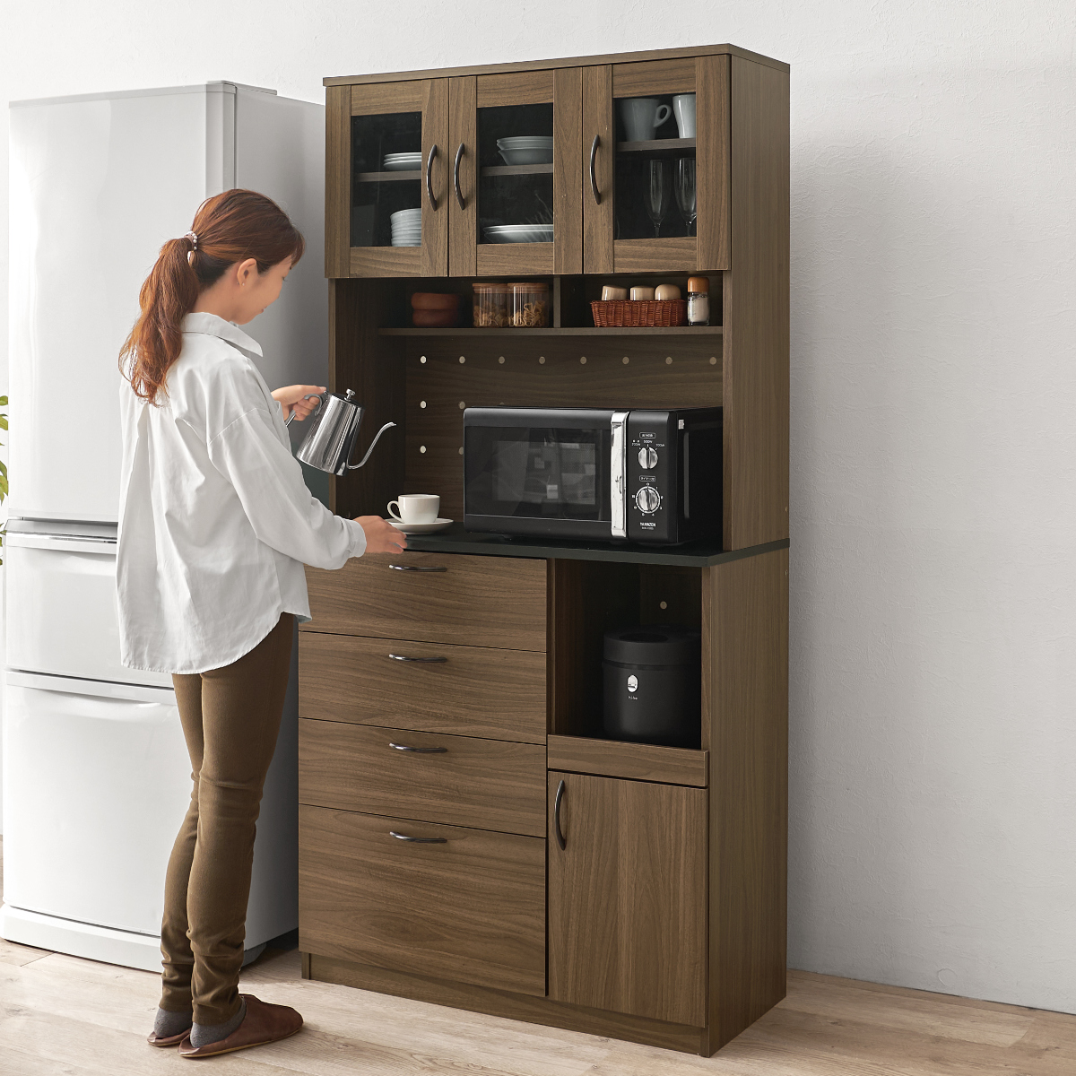 収納スペースが豊富で家電も食器もまとめて収納できる大容量タイプのキッチンボードです。引出しやスライド収納、大きさの違う扉収納などの機能がたくさん。幅89cm高さ182cmのたっぷりサイズで、キッチンがスッキリと片付きます。