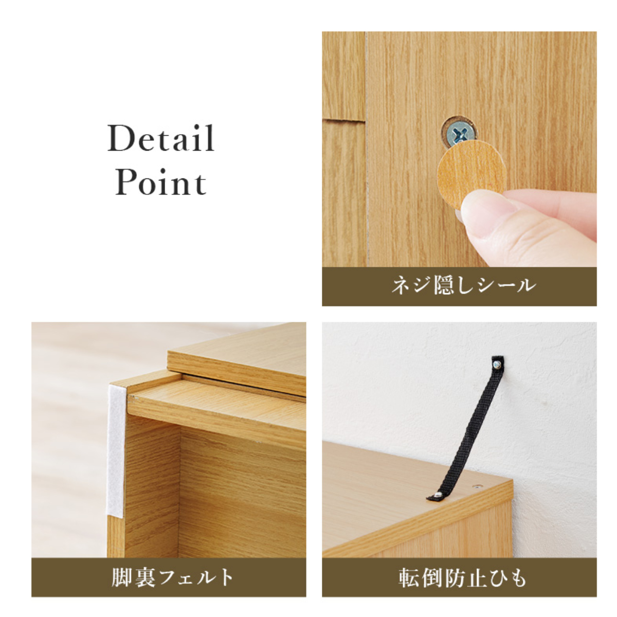 ネジが見えて不格好にならないためのネジ隠しシール、床をキズ付けないための脚裏フェルト、万が一の際の転倒を防ぐ転倒防止ひもが付属しています。