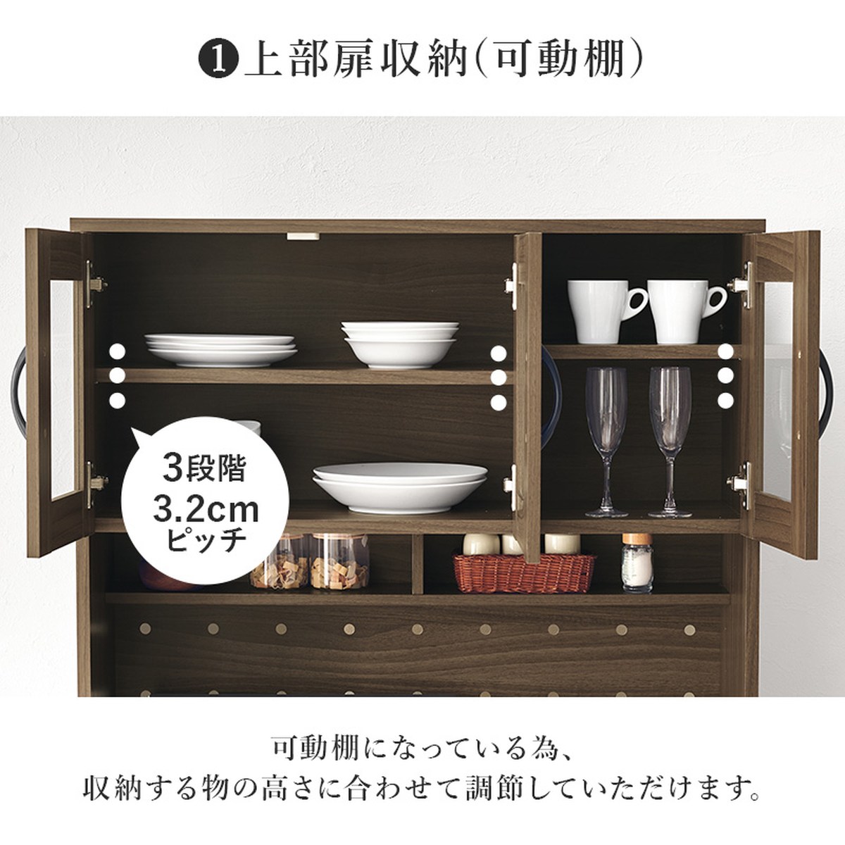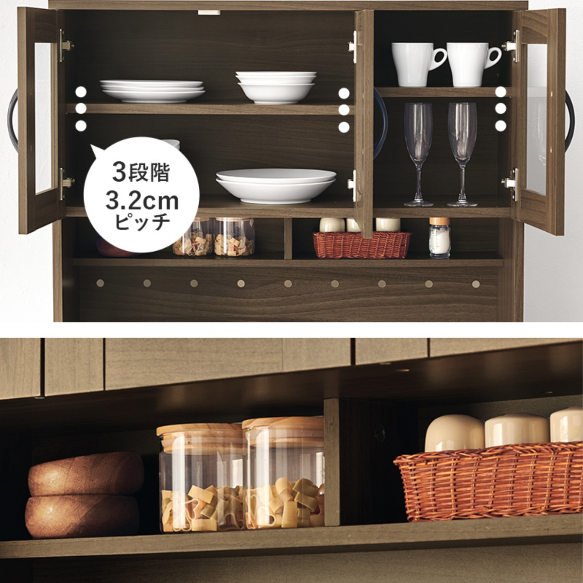上段の扉収納は、中身が見えるガラス扉を採用。上段下にはディスプレイ棚もあり、お気に入りの食器や雑貨等のディスプレイも楽しめます。棚板は、収納したい物に合わせて高さを調節できる可動式です。