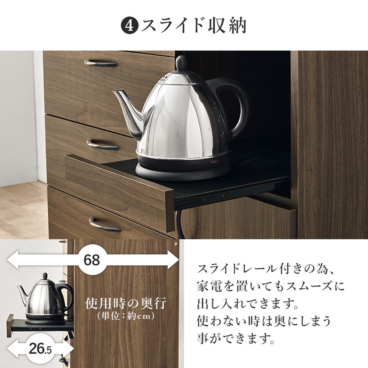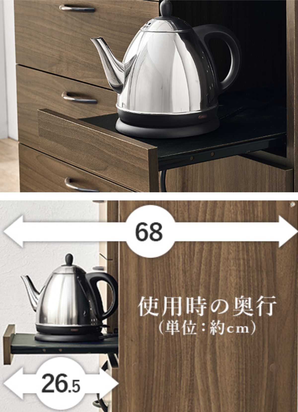 スライドレール付きで、ケトルや炊飯器等の蒸気が出る家電を置いてもスムーズに出し入れできます。