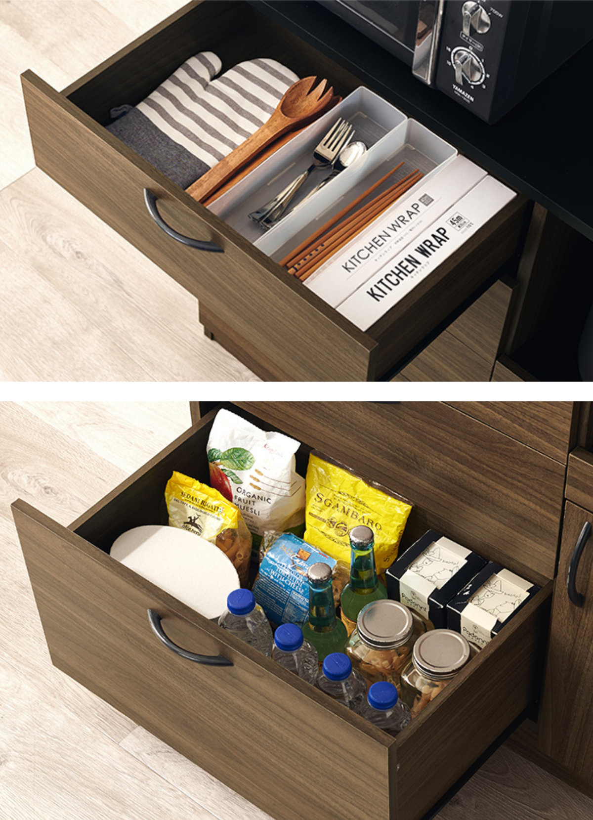 小サイズの引出しにはカトラリーや布巾などの小物を、大サイズの引出しは、重い瓶や食品ストック等を整理できます。スライドレール仕様なので、開閉がスムーズにできます。