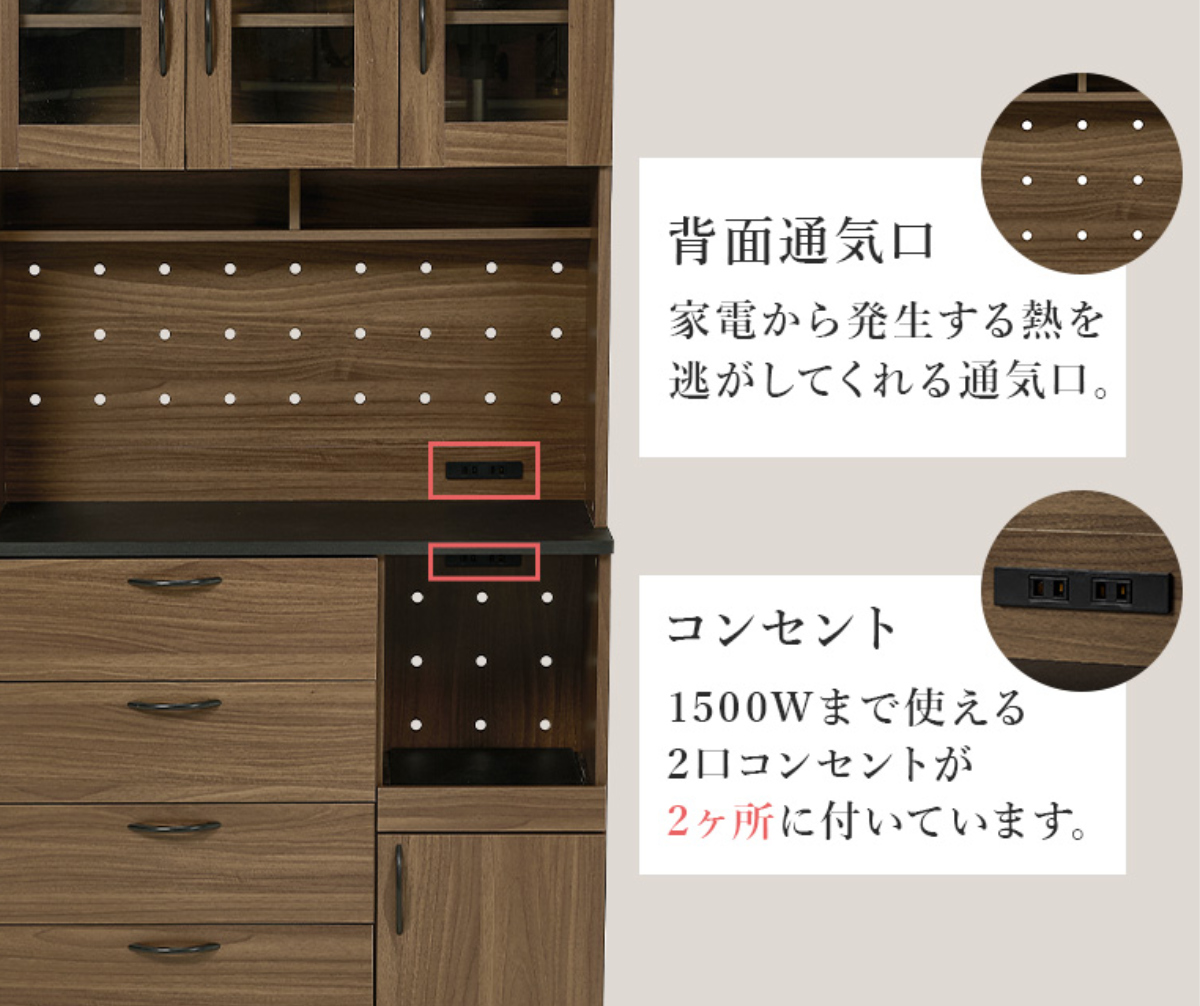 オープンスペースとスライド収納の背面には、熱を逃がしてくれる通気口と、1500Wまで対応した2口コンセントが設置されています。
