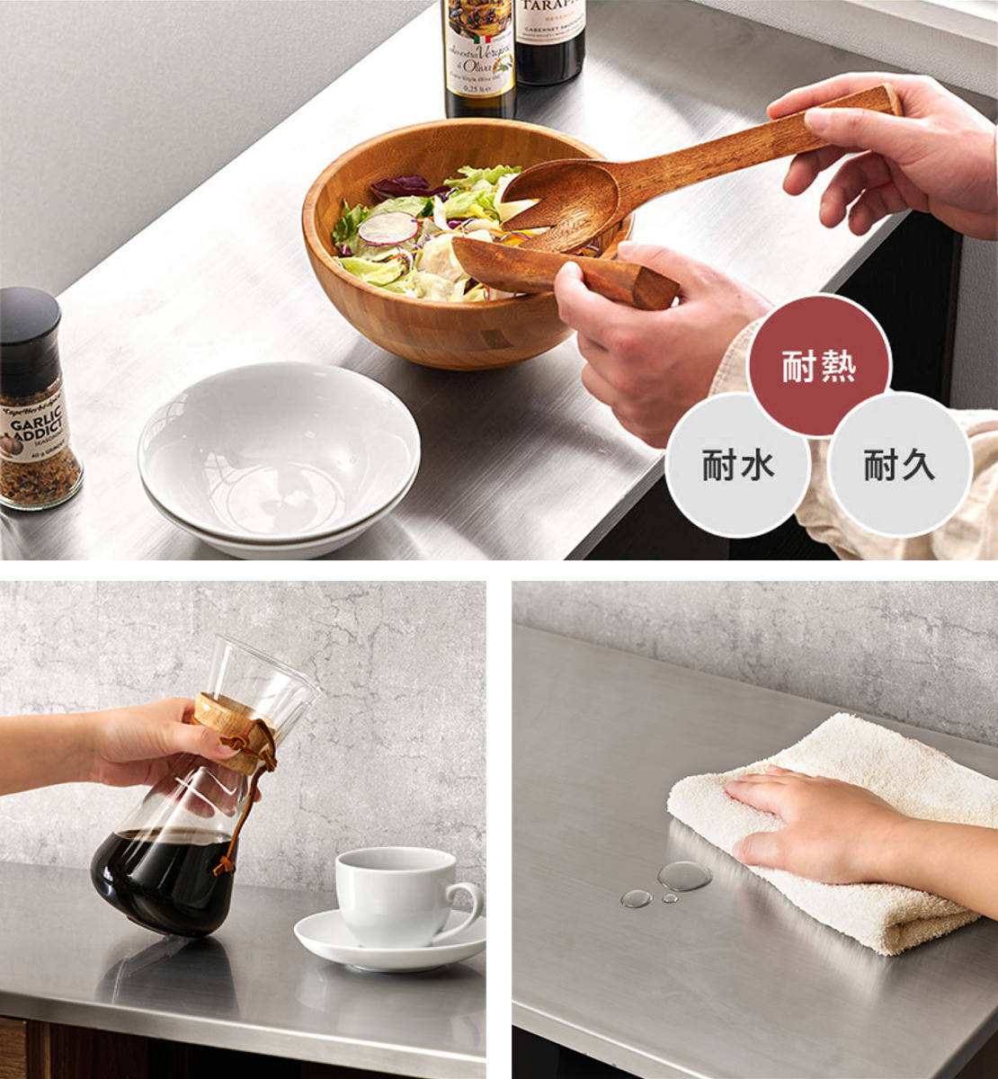 天板はタフなステンレス素材を使用しているので、熱い鍋や濡れた食材でもOK。油汚れやニオイも付きにくく、サッと拭くだけで清潔な状態を保てます。毎日使うキッチンでも気兼ねなく使える、実用性に優れた仕上がりです。