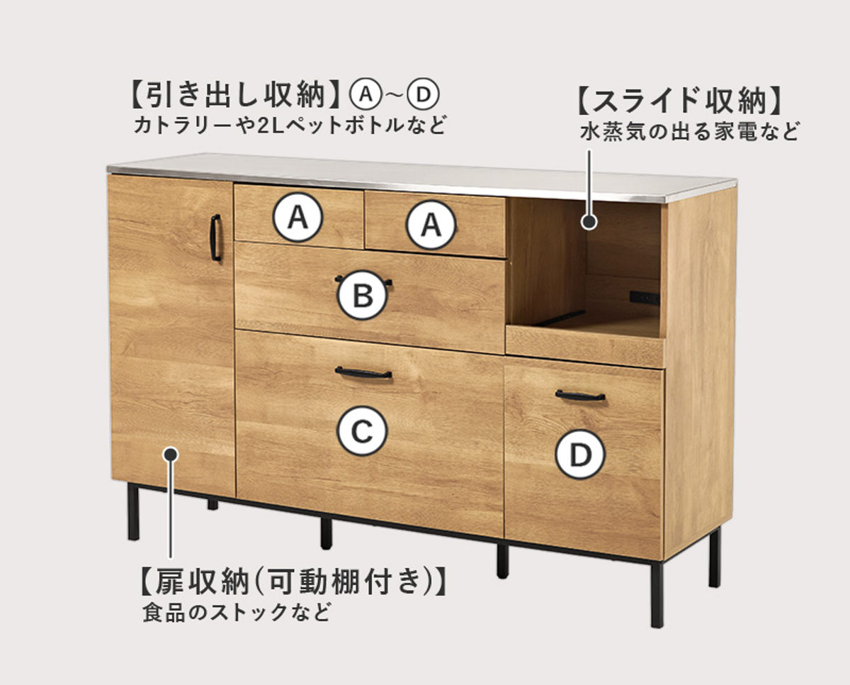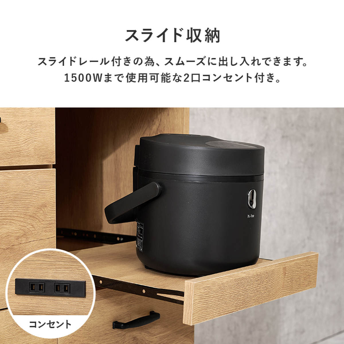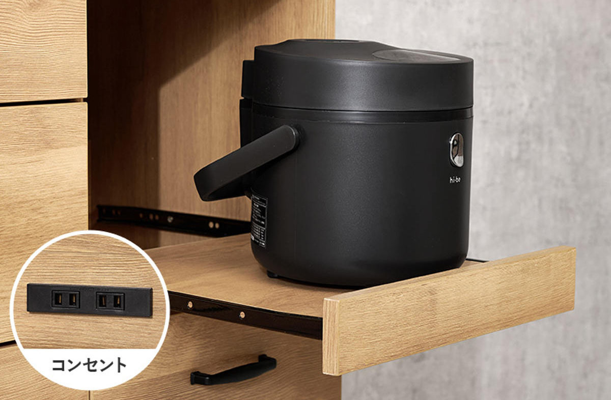 炊飯器や電気ケトルなどのキッチン家電を置くのに便利なスライド棚付きです。手前に引き出せるためフタの開閉や操作がしやすく、蒸気がこもりにくいのもポイントです。使わないときはすっきり収まり、キッチンを広く使えます。