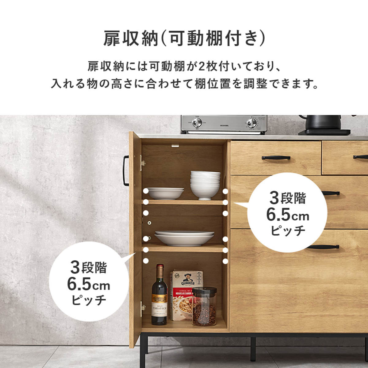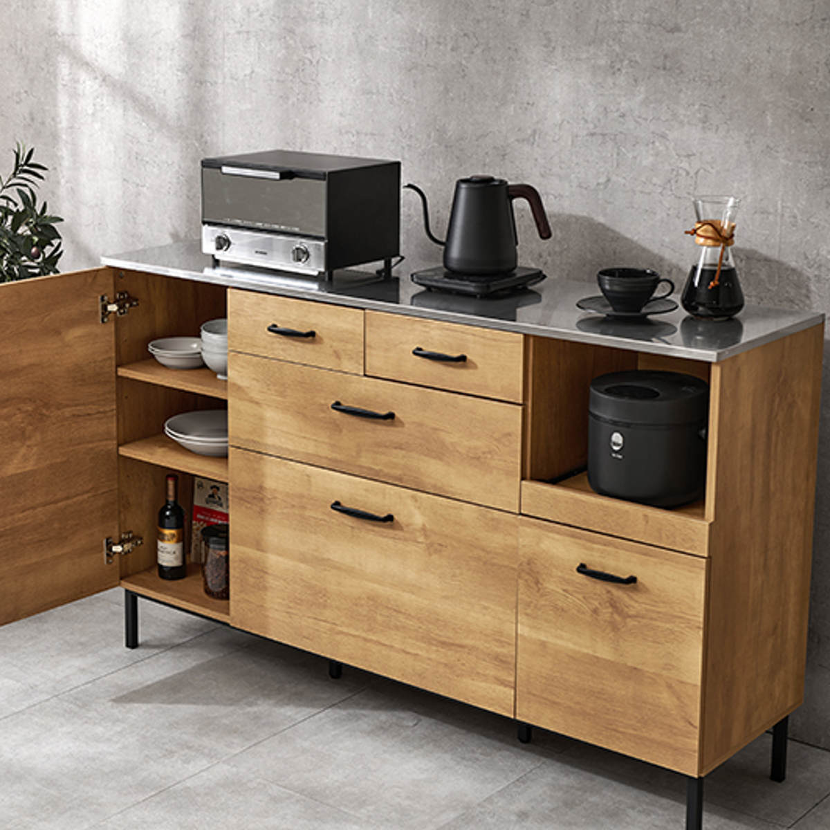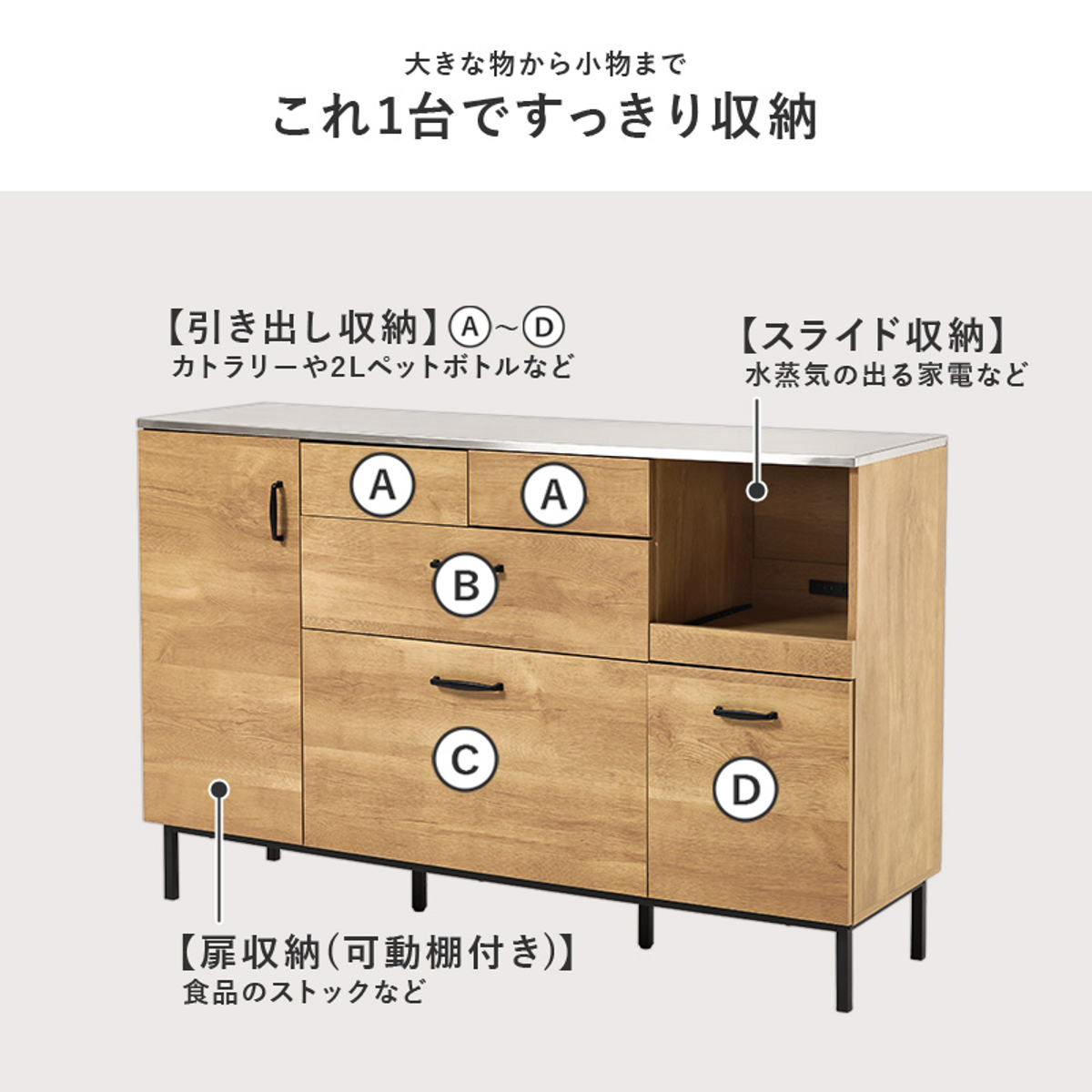 炊飯器や電気ケトルなどのキッチン家電を置くのに便利なスライド棚付きです。手前に引き出せるためフタの開閉や操作がしやすく、蒸気がこもりにくいのもポイントです。使わないときはすっきり収まり、キッチンを広く使えます。