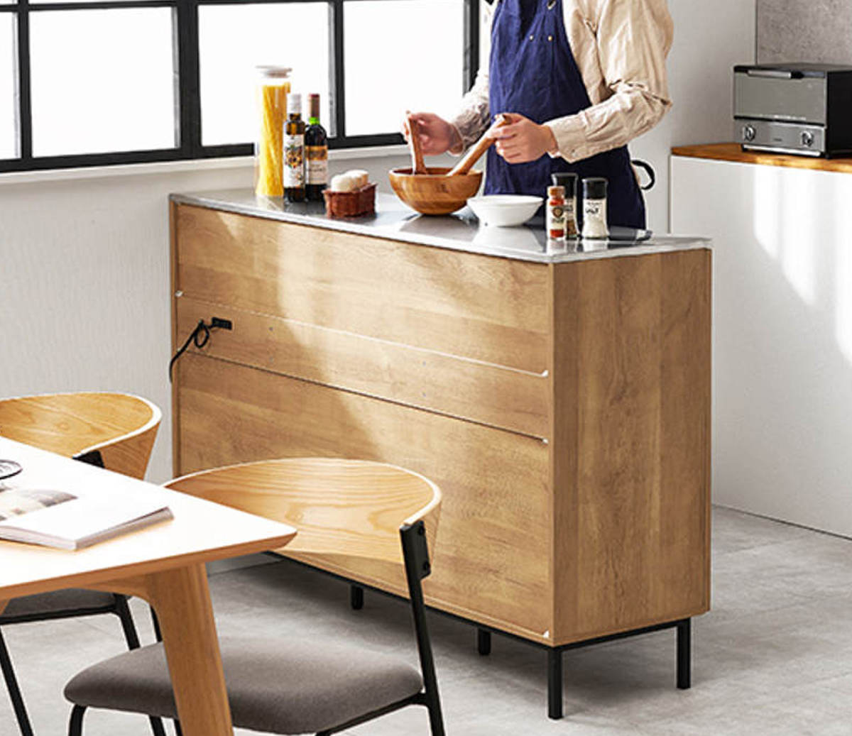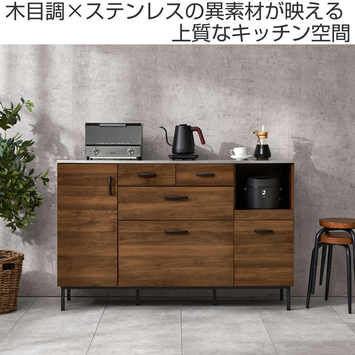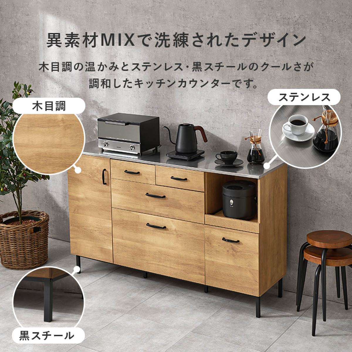 木目調の温かみと、ステンレスや黒のスチールのクールさが調和したキッチンカウンターです。キッチン家電との相性も良く、キッチンをスタイリッシュな雰囲気に演出してくれます。