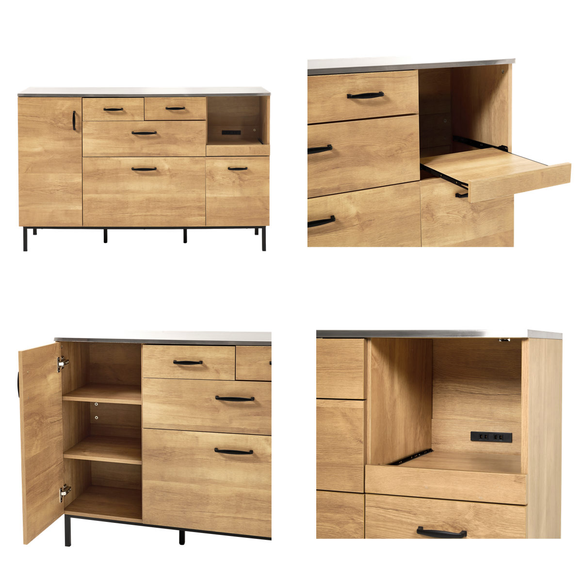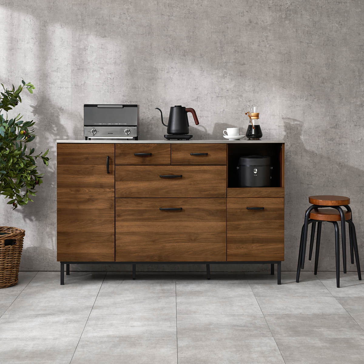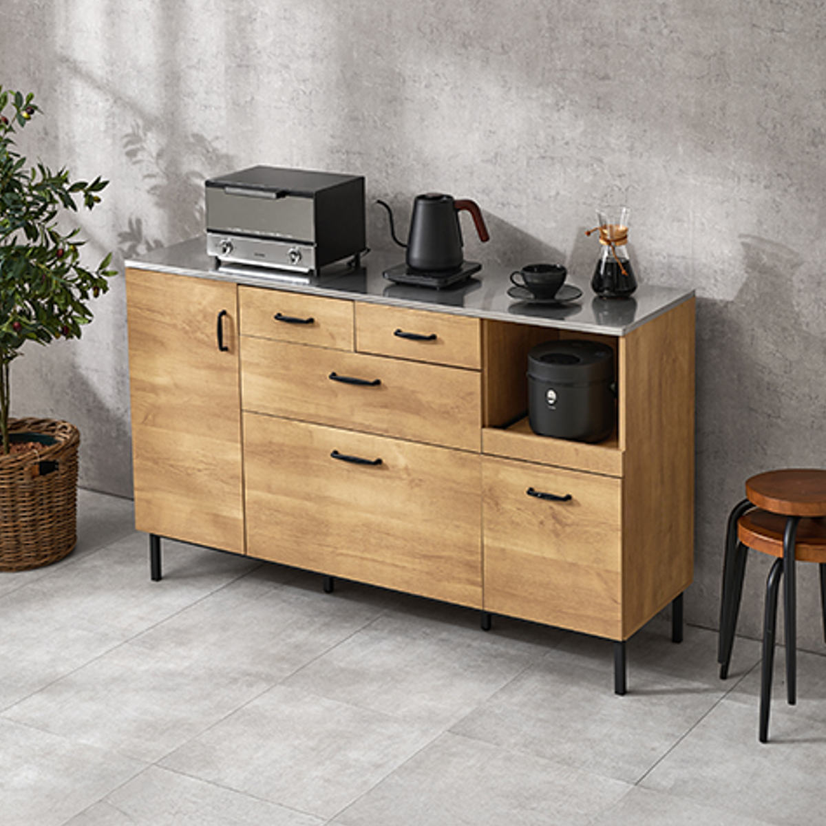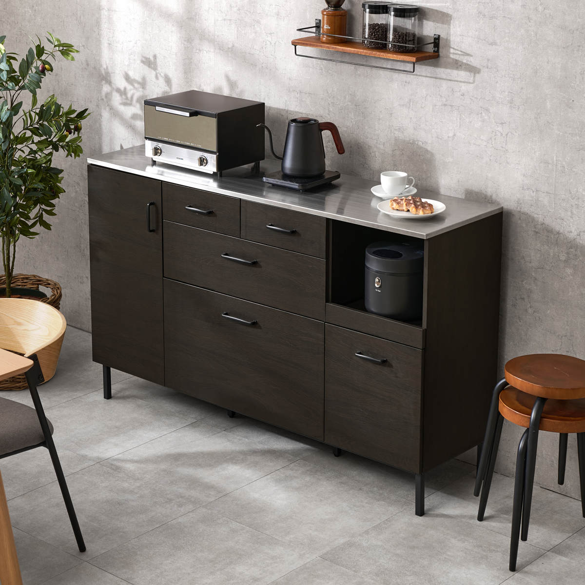 木目調の温かみと、ステンレスや黒のスチールのクールさが調和したキッチンカウンターです。キッチン家電との相性も良く、キッチンをスタイリッシュな雰囲気に演出してくれます。