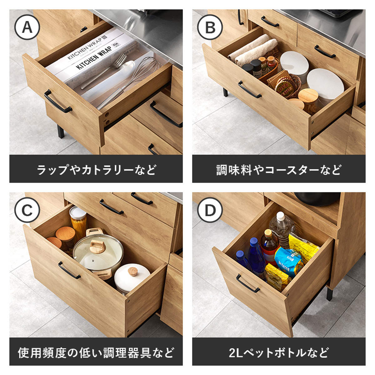 上段にはラップやカトラリーなどの細かなキッチンツールを、2段目には調味料やコースターなどをすっきりまとめて収納できます。さらに下段は深さがあるため、鍋や保存容器、2Lのペットボトルなどのかさばるアイテムにも対応します。