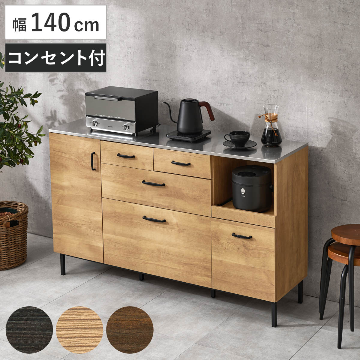 キッチンカウンター 幅140cm コンセント付き ステンレス天板 木目調 ( カウンター 作業台 家電ラック 収納 可動棚 お掃除ロボット対応 食器棚 棚 ラック 2口コンセント付 脚付 ダークブラウン ナチュラル ウォールナット ) 【ナチュラル】