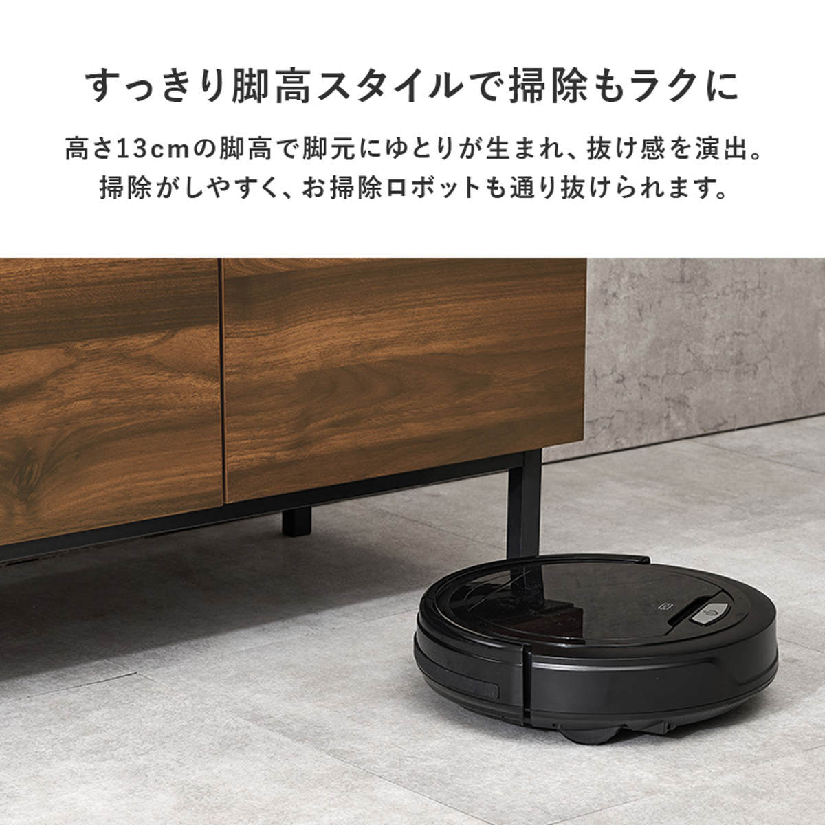 高さ13cmの脚付きデザインで脚元にゆとりが生まれ、抜け感を演出します。また、掃除機ヘッドやお掃除ロボットがスムーズに入り、お掃除もラクに行えます。