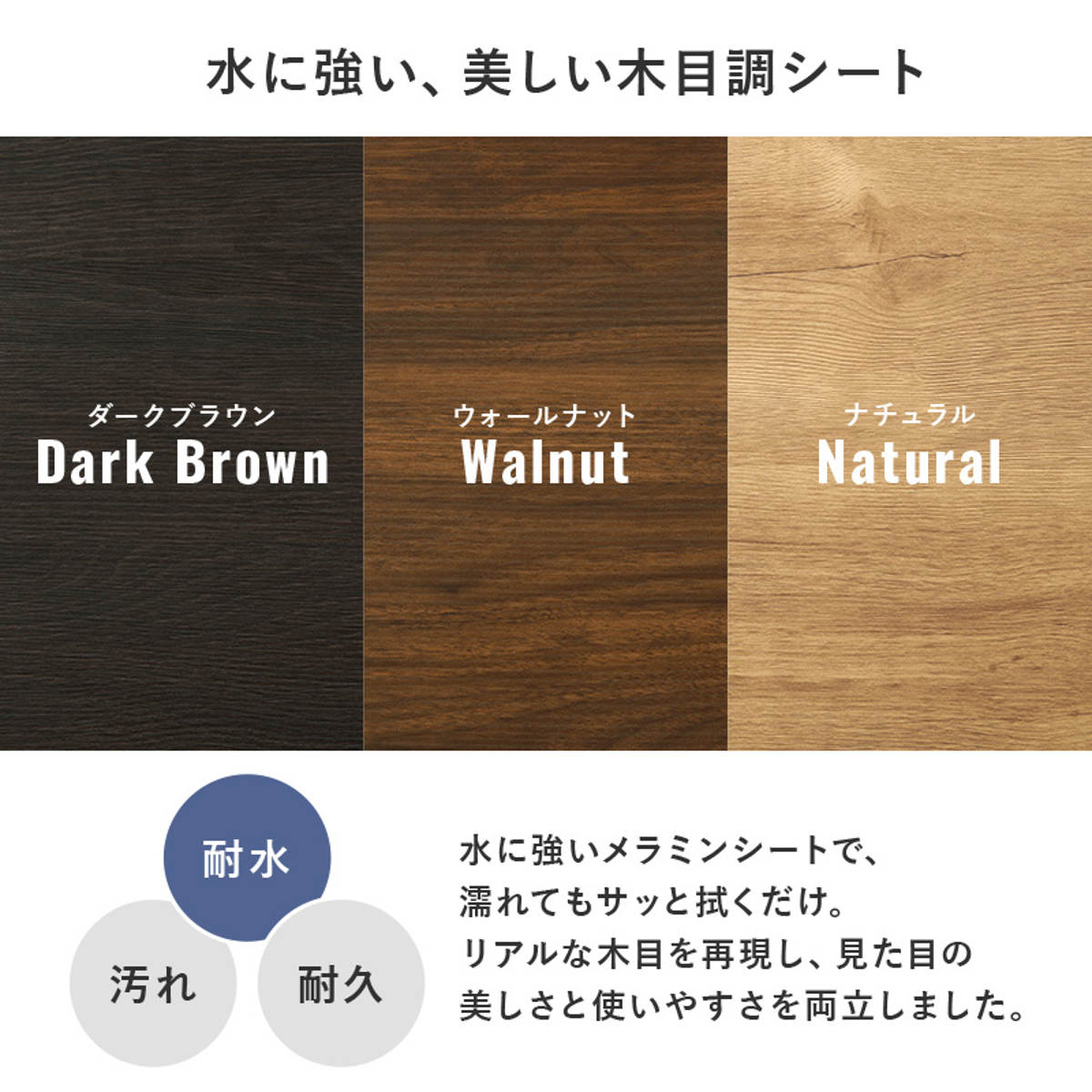 水に強いメラミンシートで、濡れても簡単にお手入れできます。リアルな木目を再現し、見た目の美しさと使いやすさを両立しました。