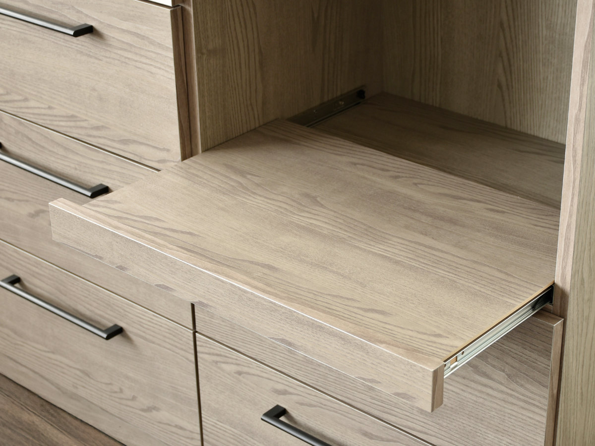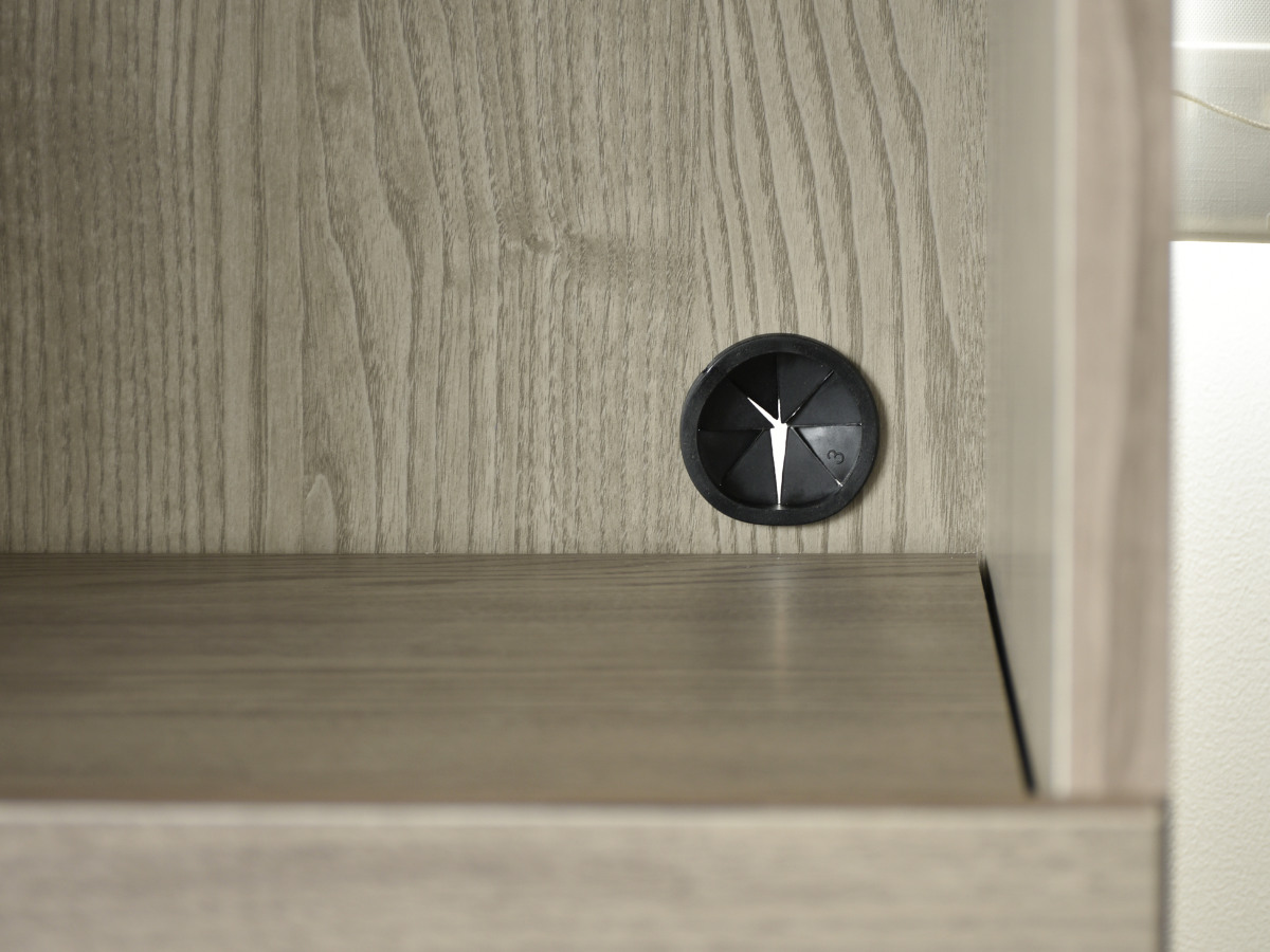 スライド棚は、炊飯器や電気ケトルなどの使用時に手前に引き出して快適に使えます。コード穴が付いているので、コードを背面へすっきり逃がせるので、見た目もきれいに設置できます。