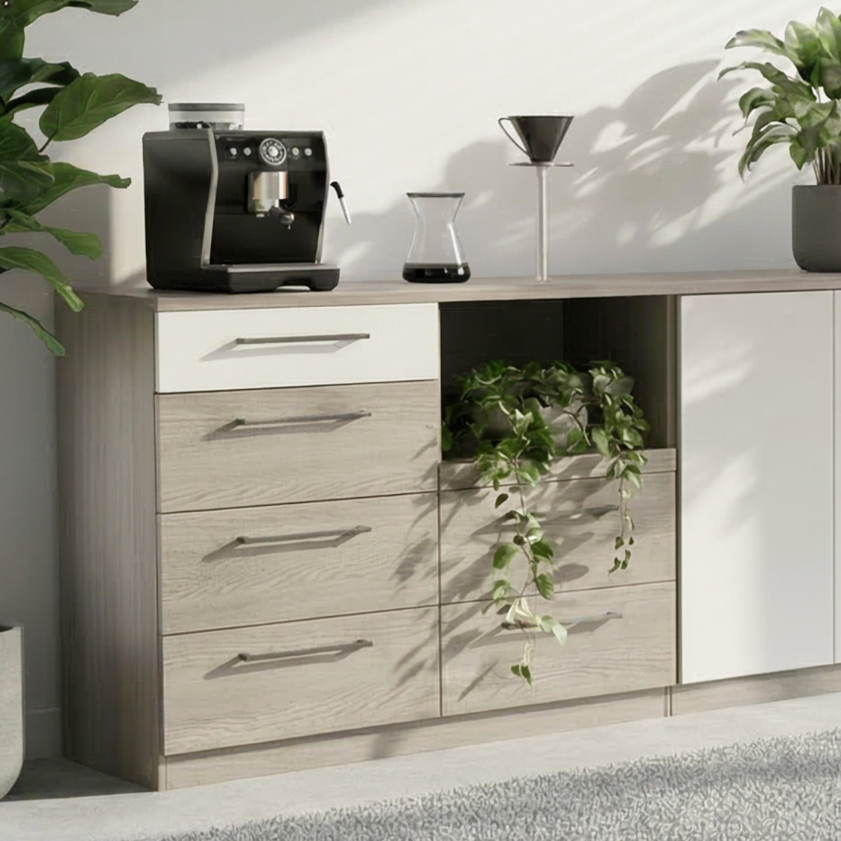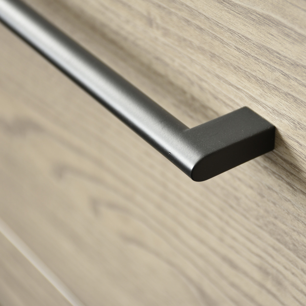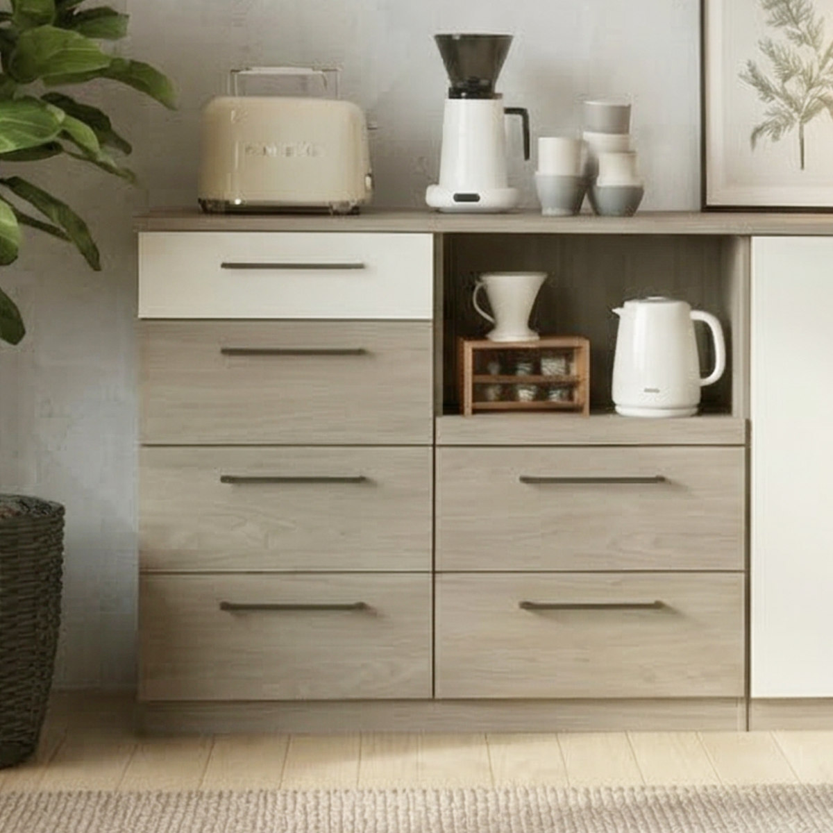 ナチュラルな木目調と、アクセントになるブラックの取っ手が印象的なキッチンボード幅120cmです。空間にすっとなじみながら、ほどよく引き締まったおしゃれな雰囲気を演出します。