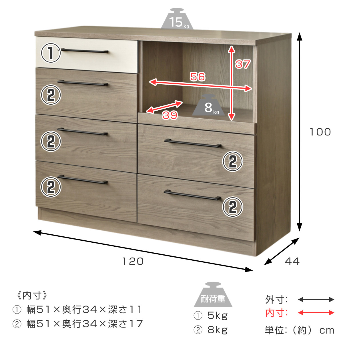 | 引き出し1段あたり耐荷重 | 左上:5kg その他:8kg |
