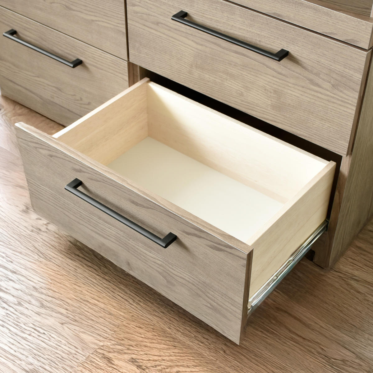 引出しはスムーズに開閉できるスライドレール仕様で、重たい食器やストック類もストレスなく出し入れできます。