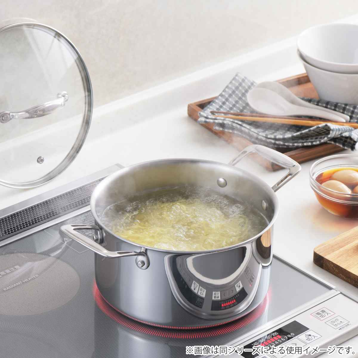 調理中の様子を確認することができるガラス蓋付きです。吹きこぼれや煮込みすぎを防ぎ、料理の美味しいタイミングを逃しません。