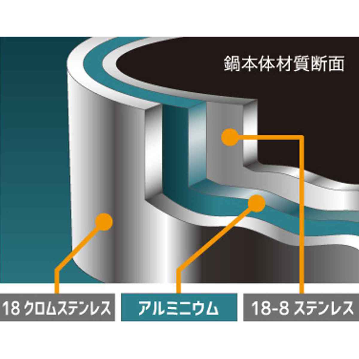 熱伝導に優れたアルミを、保温性に優れたステンレスで挟んだ3層構造です。すばやく均一に熱が広がるため、食材にムラなく火が通り美味しく仕上がります。