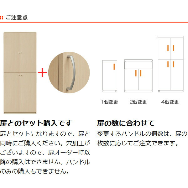 扉とのセット購入です扉とセットになりますので、扉と同時にご購入ください。穴加工がございますので、扉オーダー時以降の購入はできません。ハンドルのみの購入もできません。 | 扉の数に合わせて変更するハンドルの個数は、扉の枚数に応じてご注文できます。 |