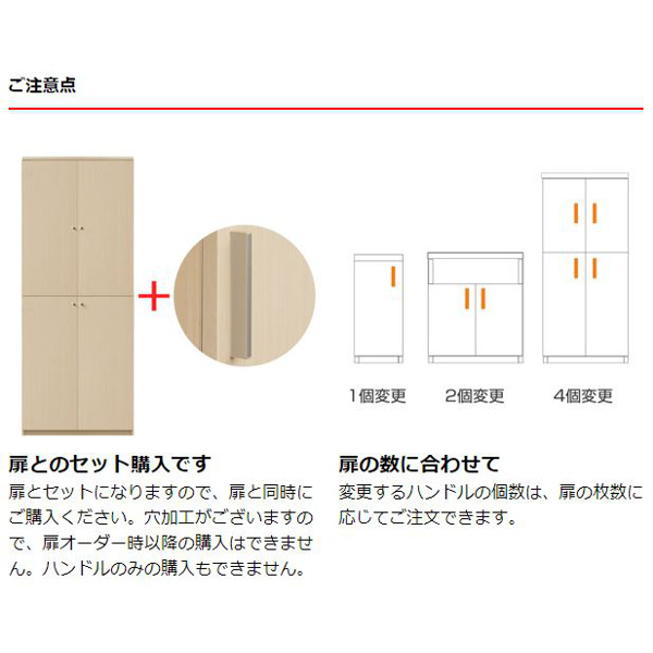 | 扉とのセット購入です 扉とセットになりますので、扉と同時にご購入ください。穴加工がございますので、扉オーダー時以降の購入はできません。ハンドルのみの購入もできません。 | 扉の数に合わせて 変更するハンドルの個数は、扉の枚数に応じてご注文できます。 |