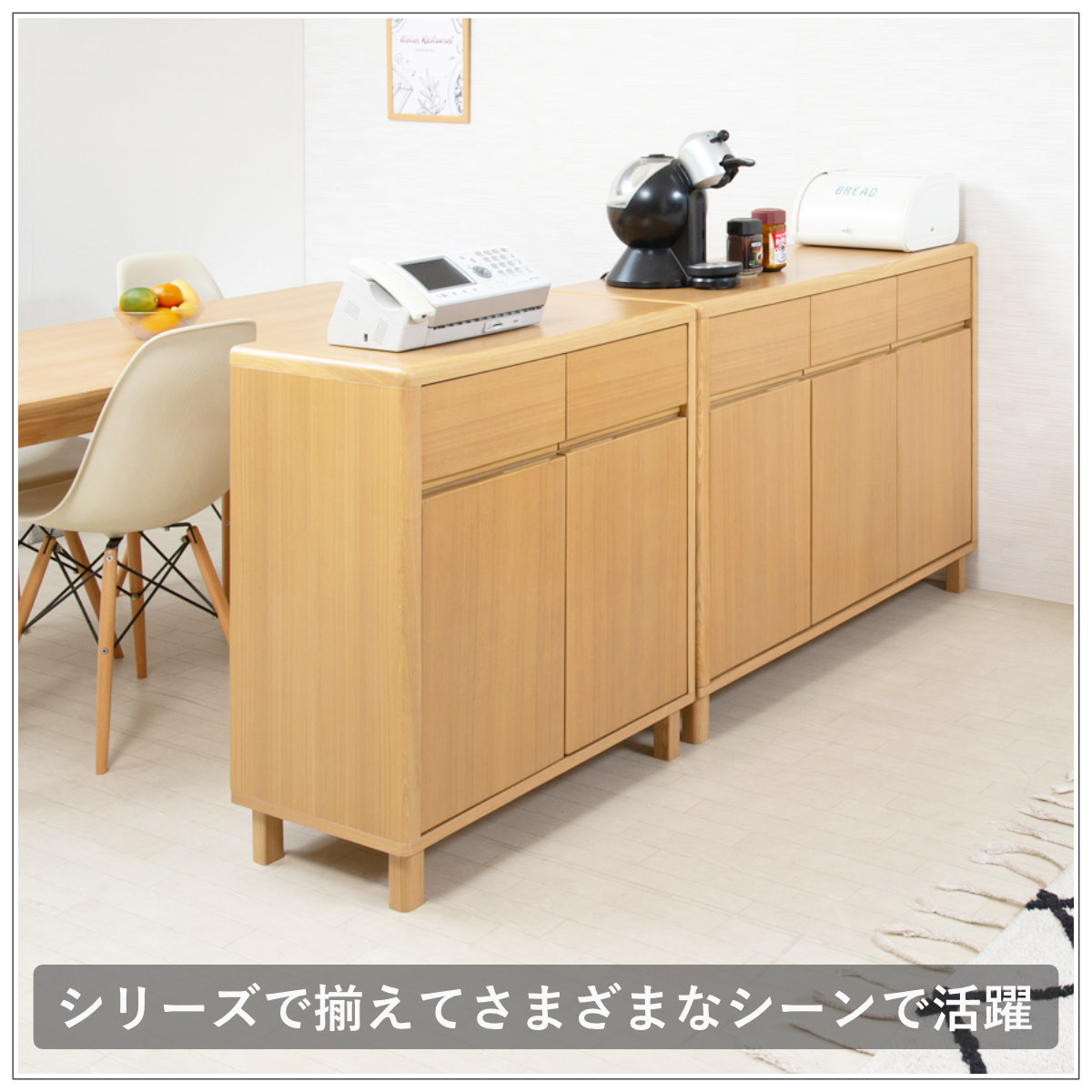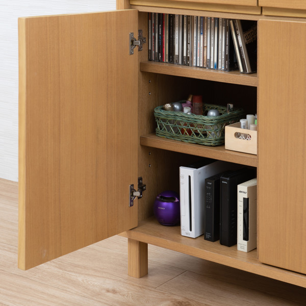 戸棚内の棚板は可動式なので、収納物によって高さを調節できます。上部の引出しと組み合わせれば、リビングでもキッチンでもしっかり収納できます。