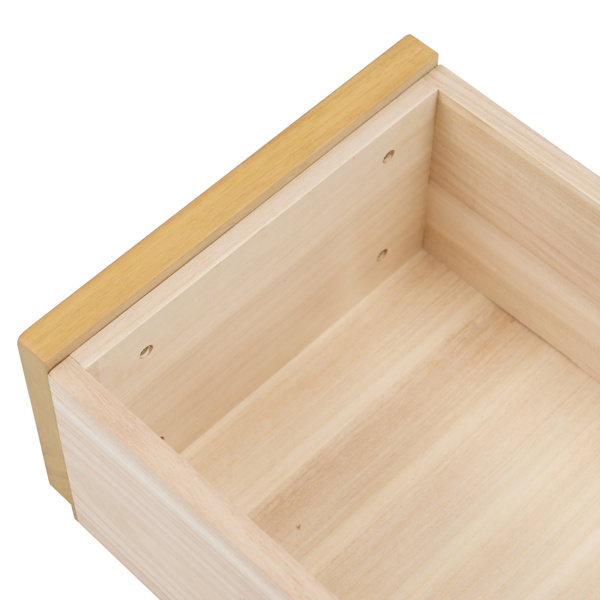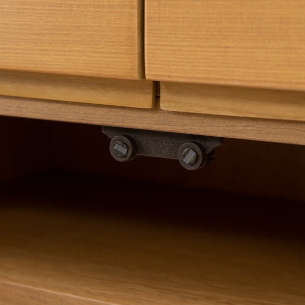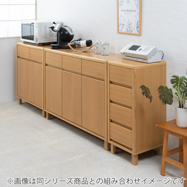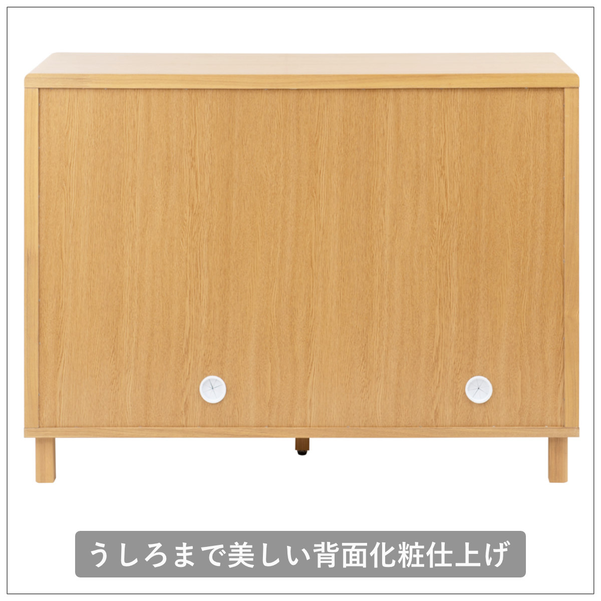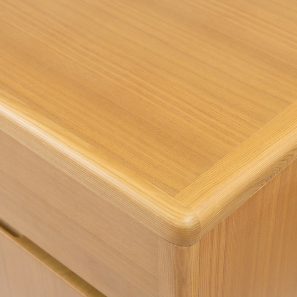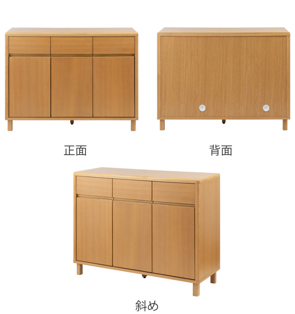 | 材質 | 天板縁・側板前面・脚部:天然木タモ材(ウレタン樹脂塗装) 前板・側板:天然木タモ化粧合板(ウレタン樹脂塗装) 本体背面・内張り・棚板:プリント紙化粧繊維板 |