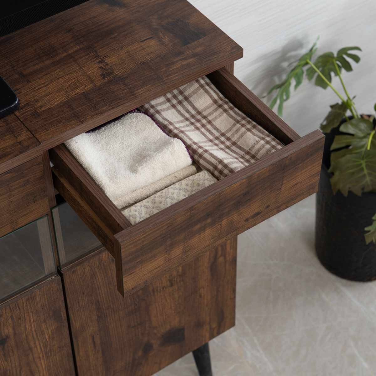 下段の収納扉はガラスと板を組み合わせており、見せる収納と隠す収納を両立できます。生活感のあるものは板扉に隠して収納し、ガラス部分にはお気に入りの雑貨を飾って楽しめます。扉はプッシュ式なので開閉がしやすいです。