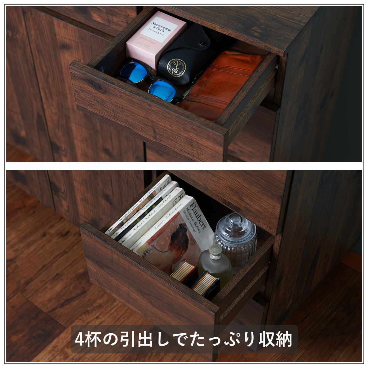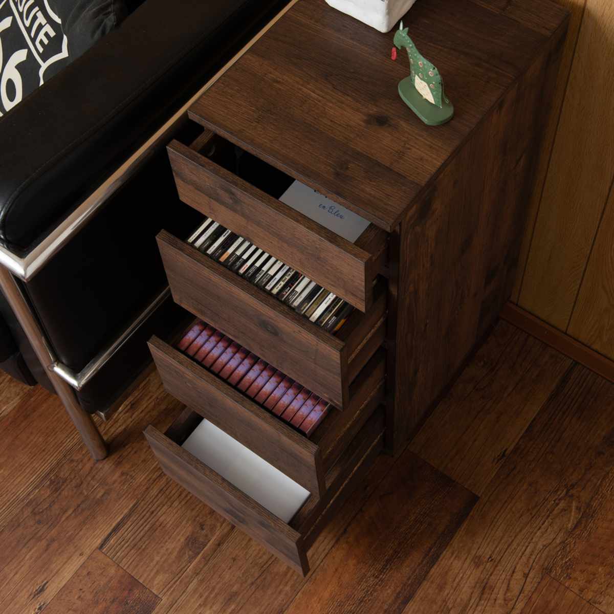コンパクトなサイズ感ですが、4杯の引出しにしっかりと収納できます。上段の引出しは使用頻度の高い小物の収納に、下3段は深めの引出しなのでDVDやストック用品などの収納にぴったりです。リビングではもちろん、寝室やランドリー、キッチンでも便利にお使いいただけます。