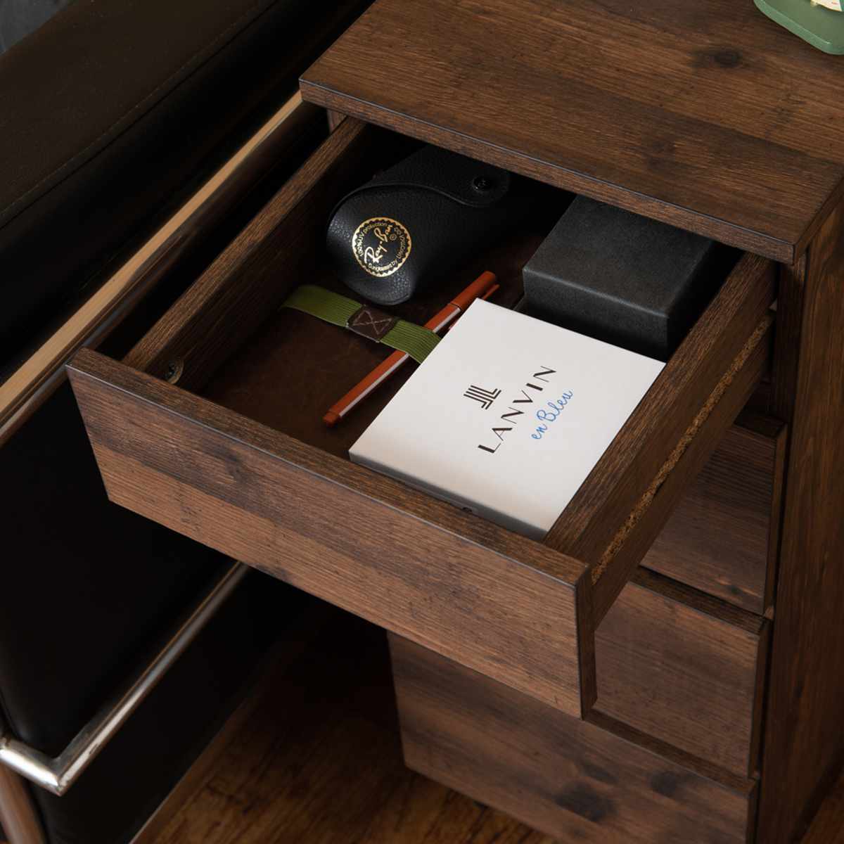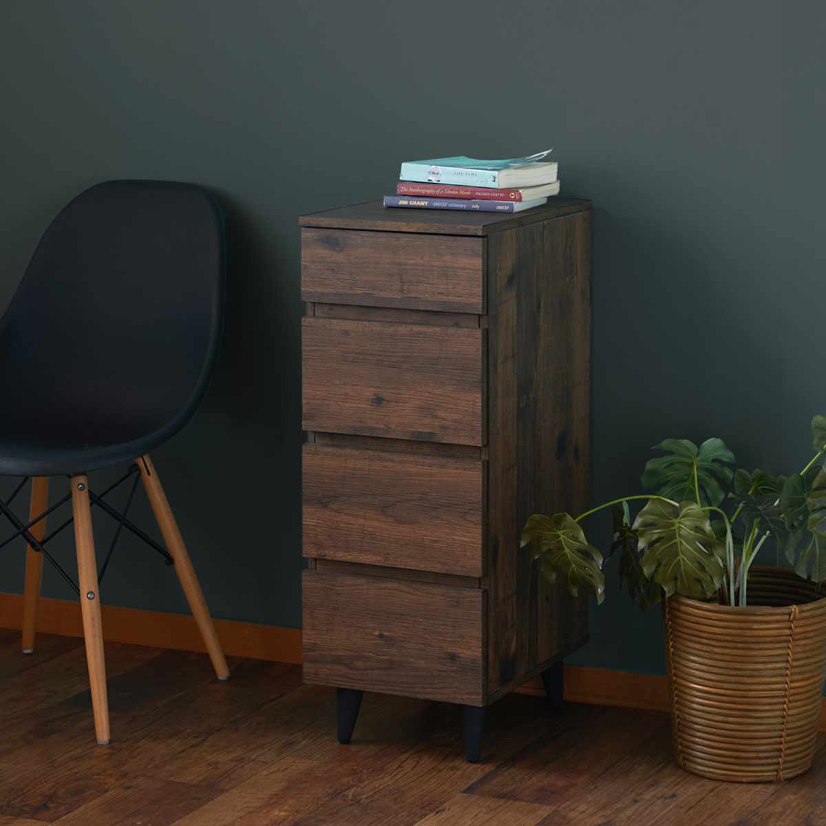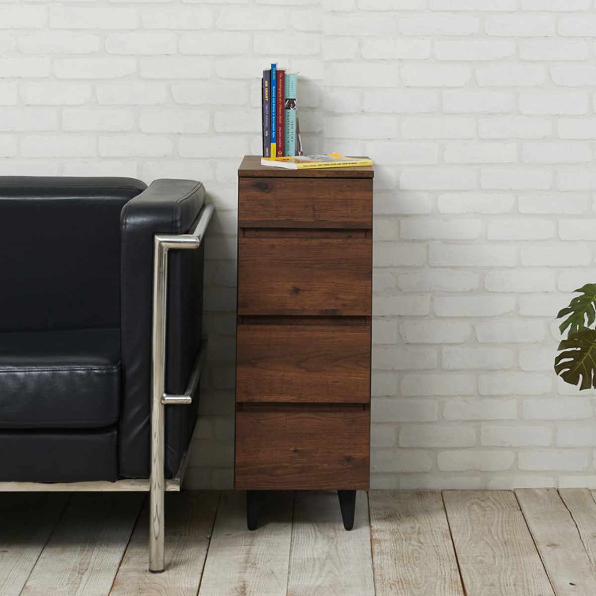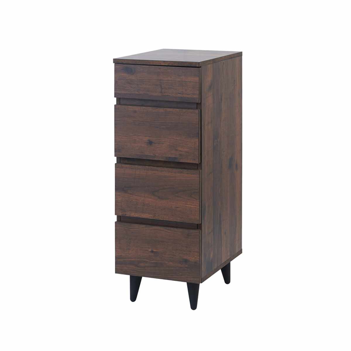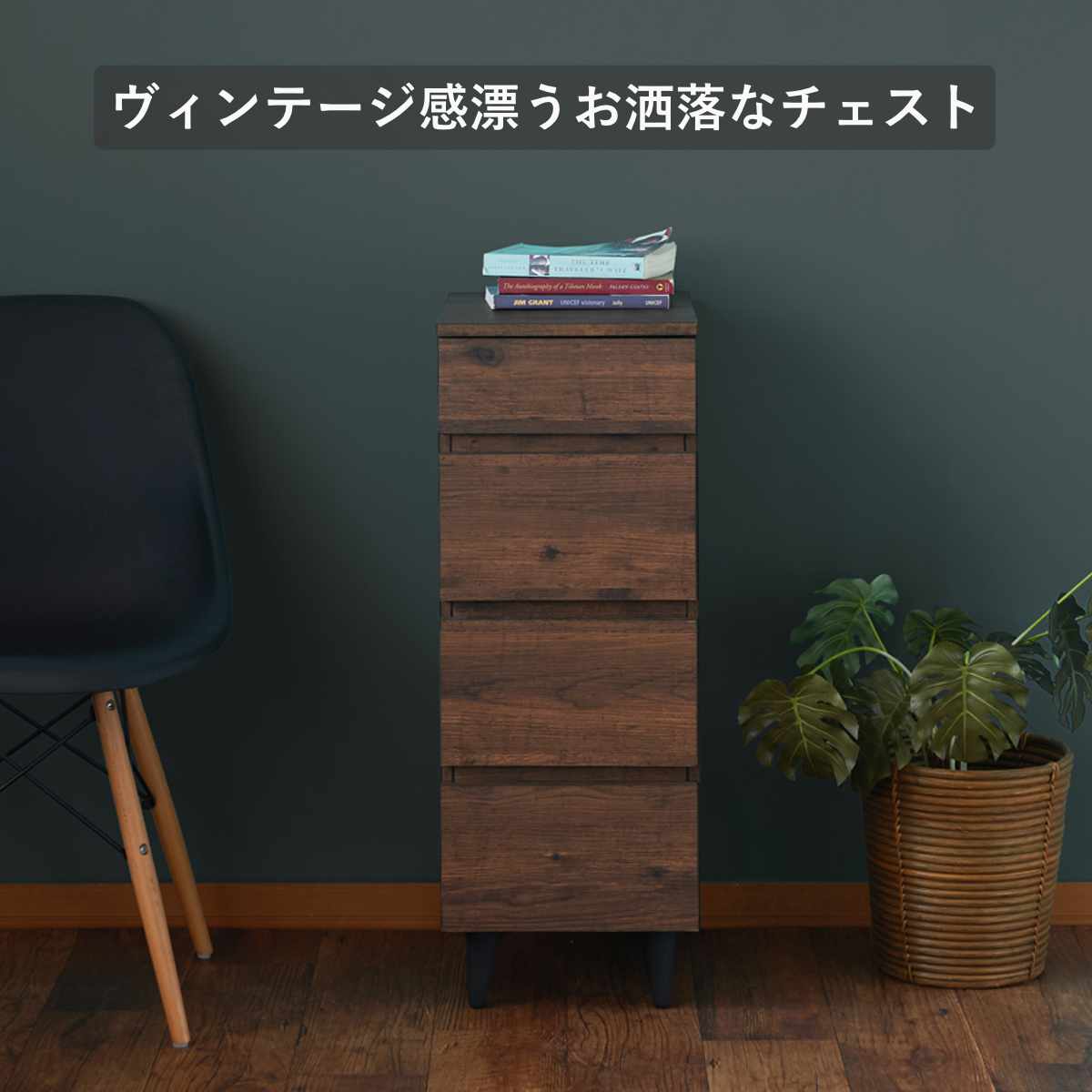 深みのあるブラウンカラーがヴィンテージ調の雰囲気を作り出すチェストです。脚部には天然木を使用し、スタイリッシュな見た目がアクセントとなっています。幅30cmとスリム設計なので、ソファサイドや玄関などにも置いていただけます。