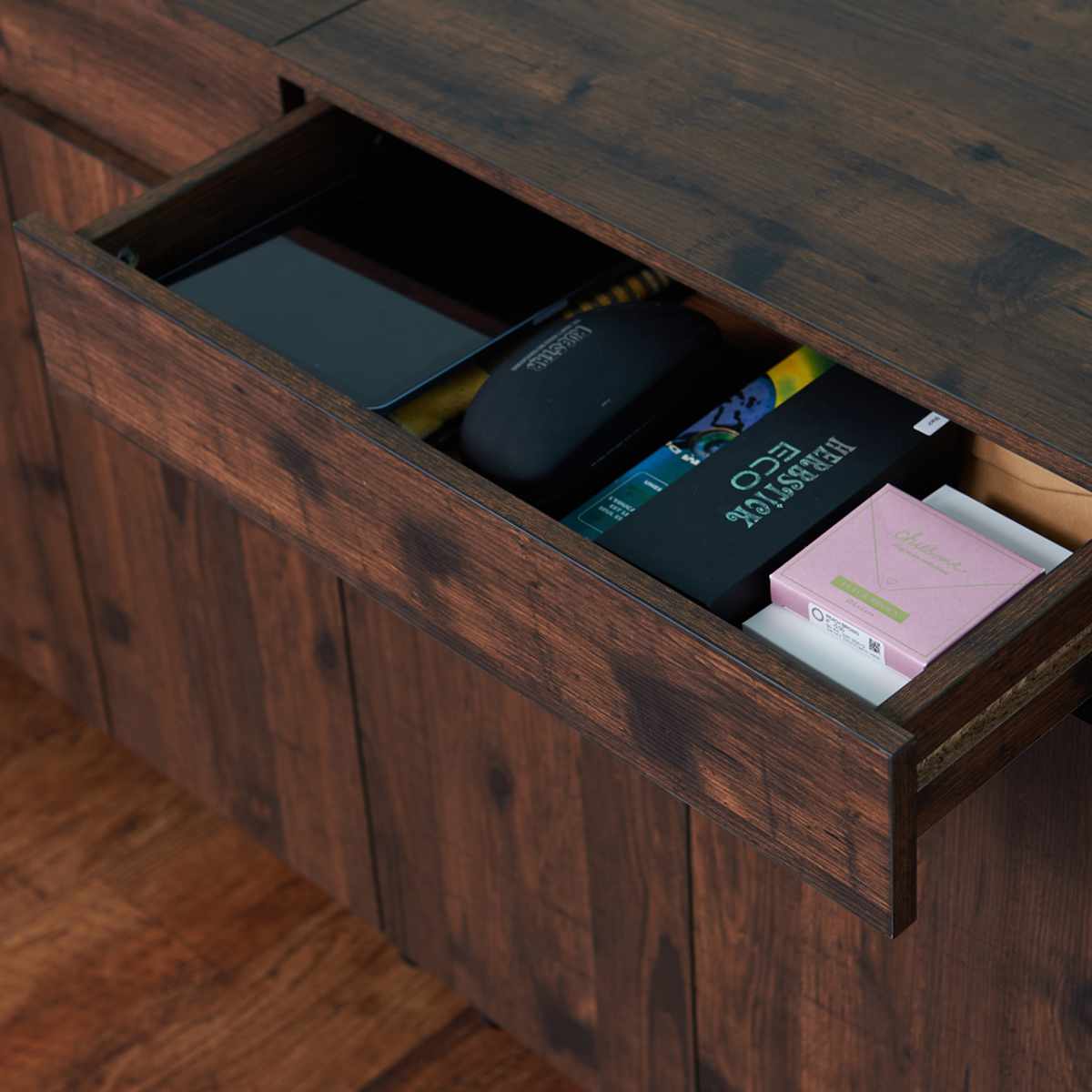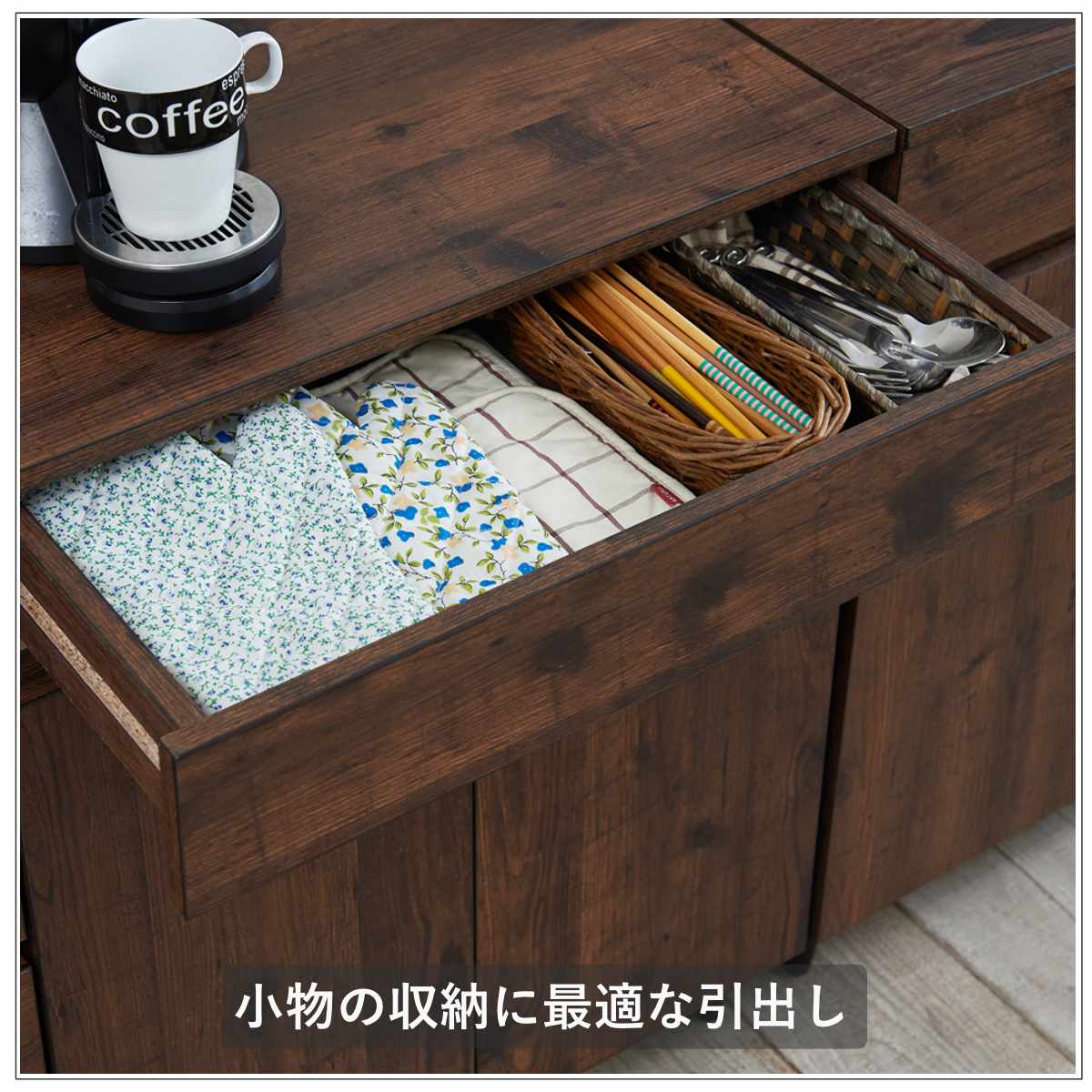 上段の引出しは、キッチン周りの布巾やカトラリー、リビング周りの小物の収納に便利です。取っ手のないデザインで、スマートな仕上がりです。