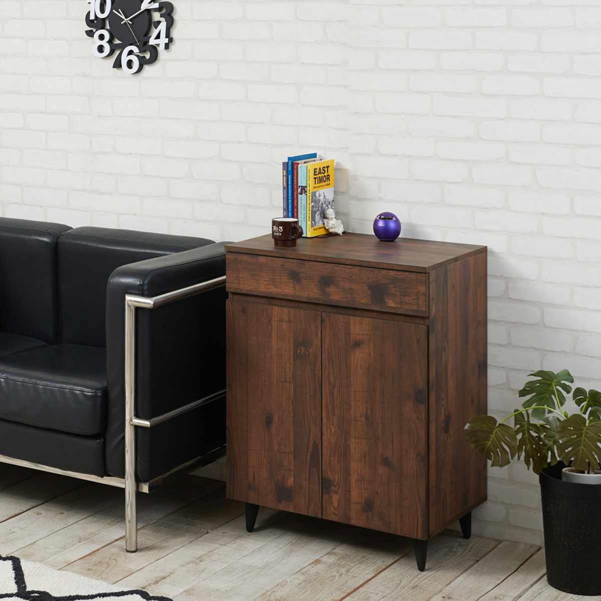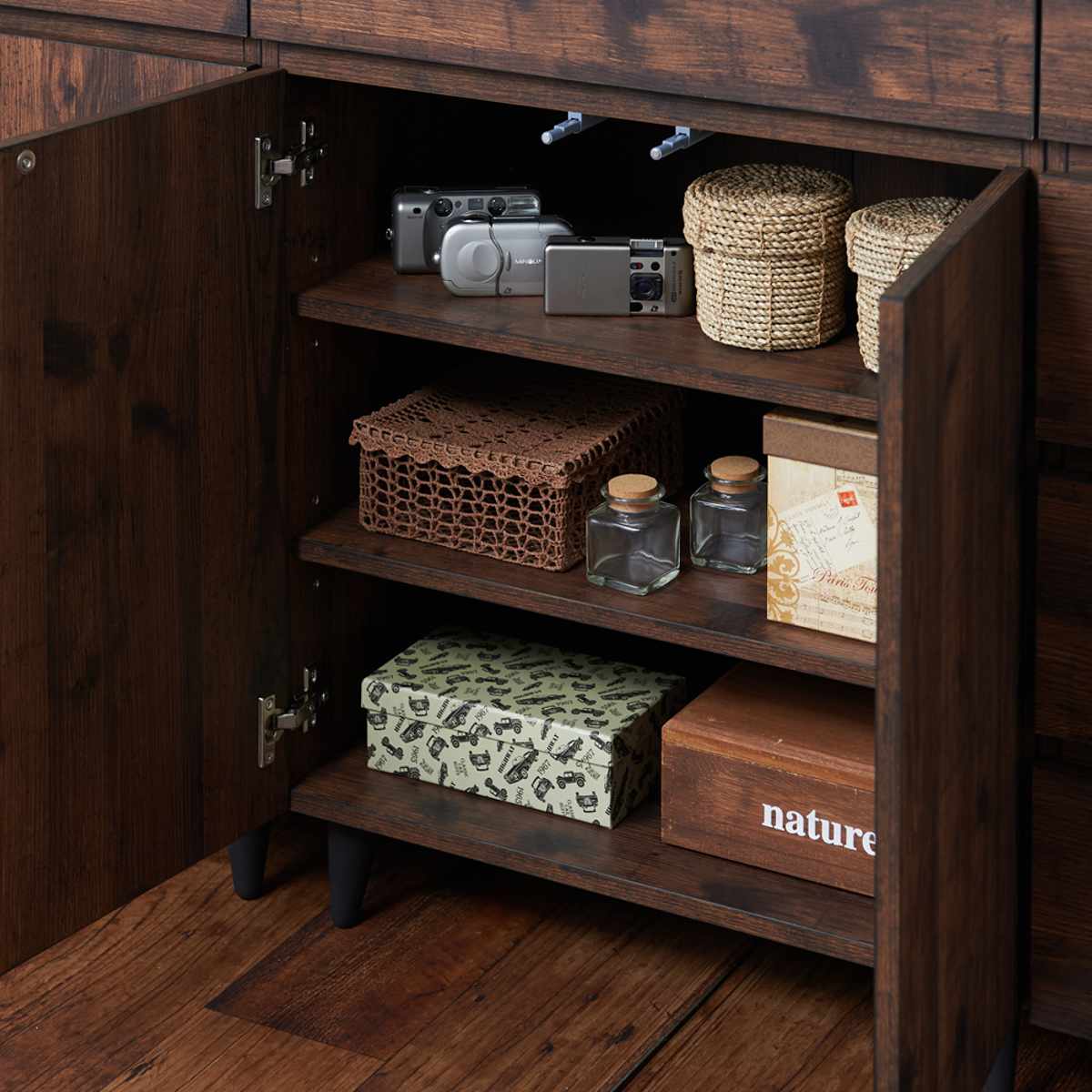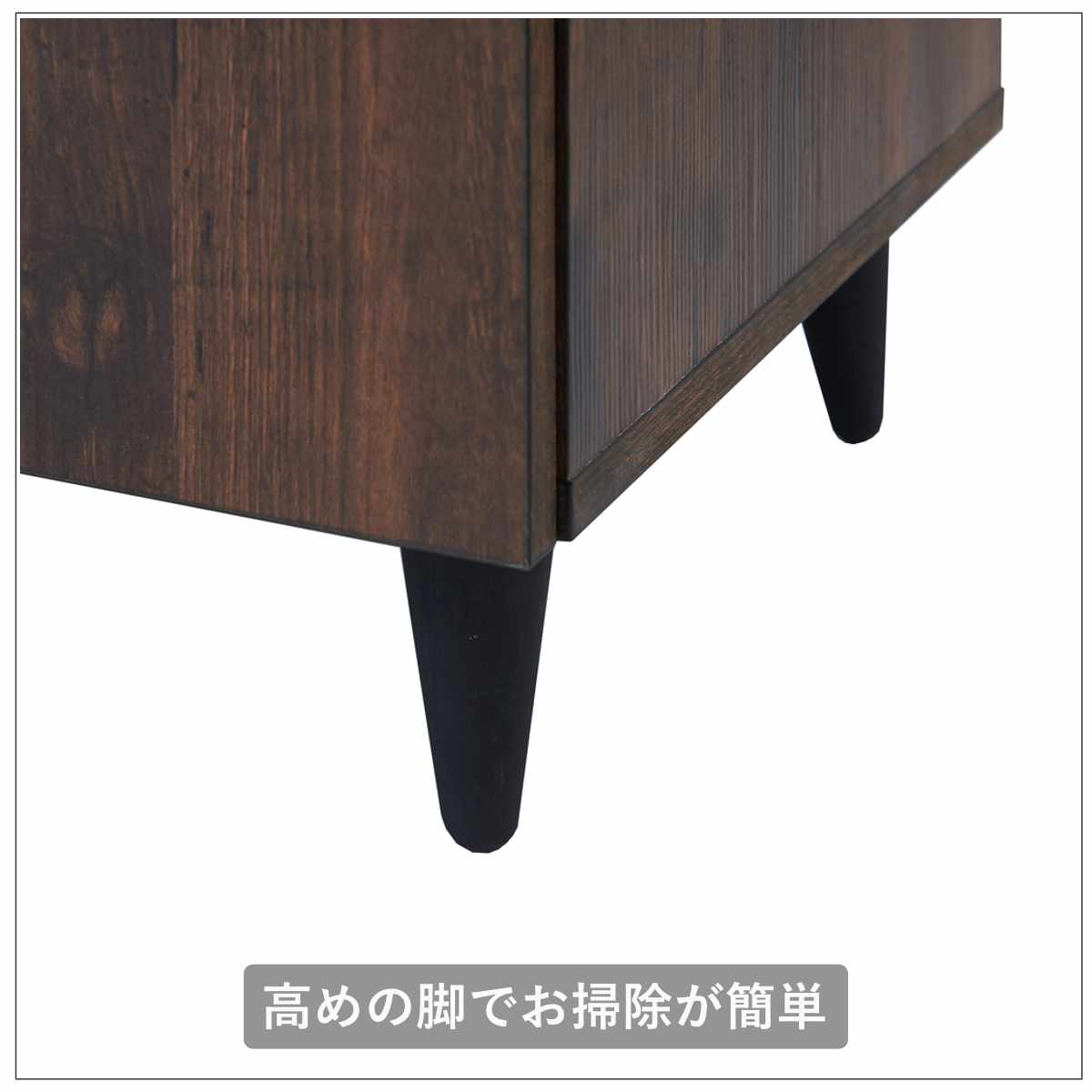 深みのあるブラウンカラーがヴィンテージ調の雰囲気を作り出すキャビネットです。脚部には天然木を使用し、スタイリッシュな見た目がアクセントとなっています。