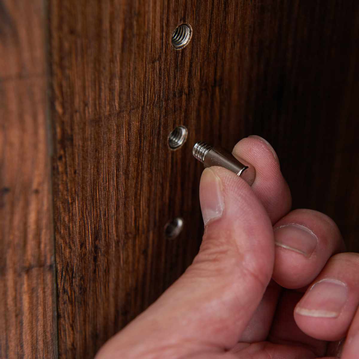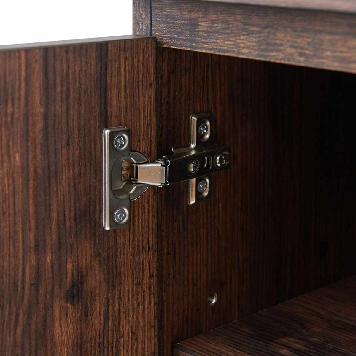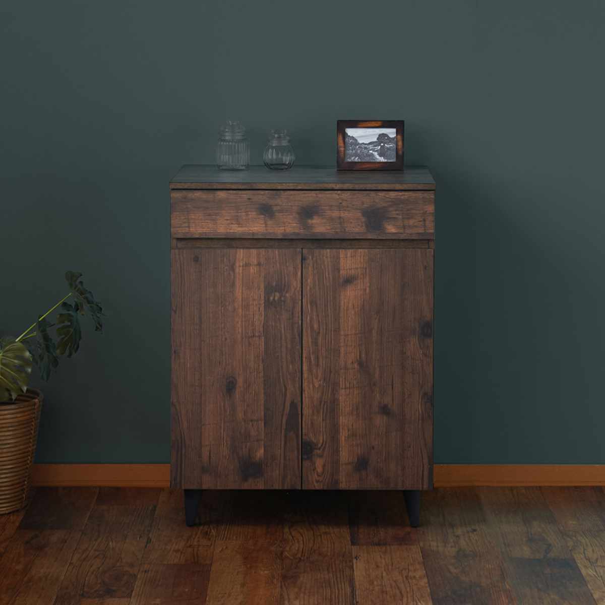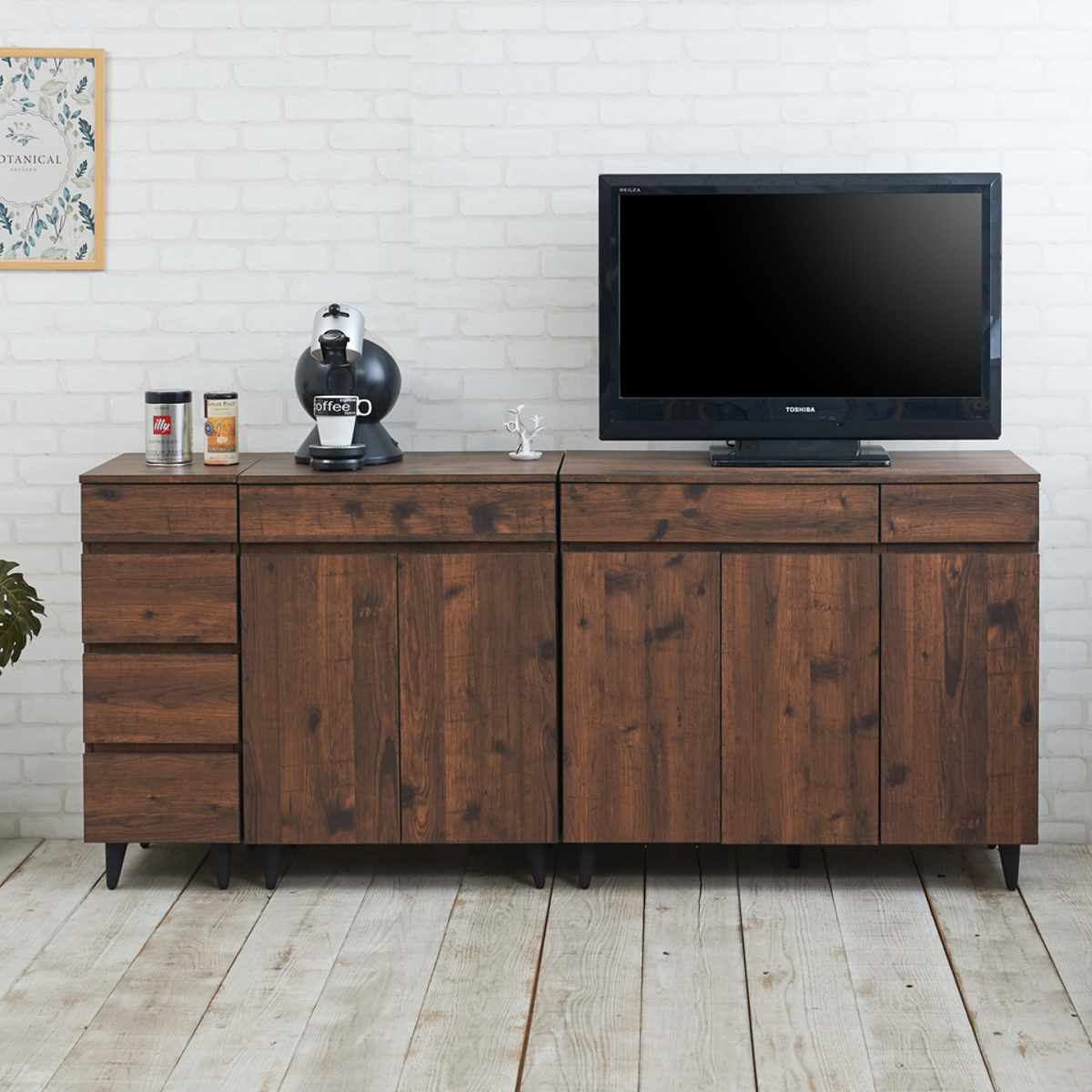 深みのあるブラウンカラーがヴィンテージ調の雰囲気を作り出すキャビネットです。脚部には天然木を使用し、スタイリッシュな見た目がアクセントとなっています。