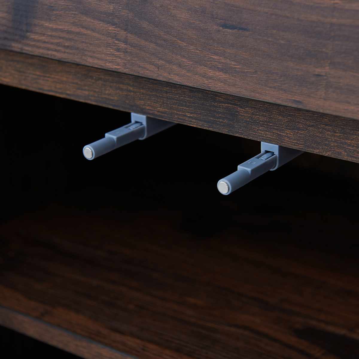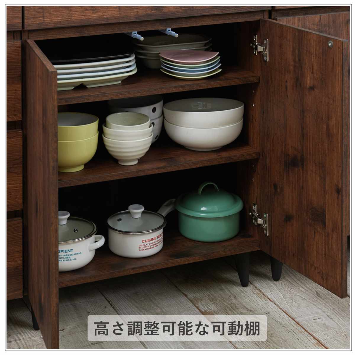 下段の扉内には可動棚が付いているので、収納物に合わせて高さを調節することができます。扉はプッシュ式なので、開閉しやすいです。
