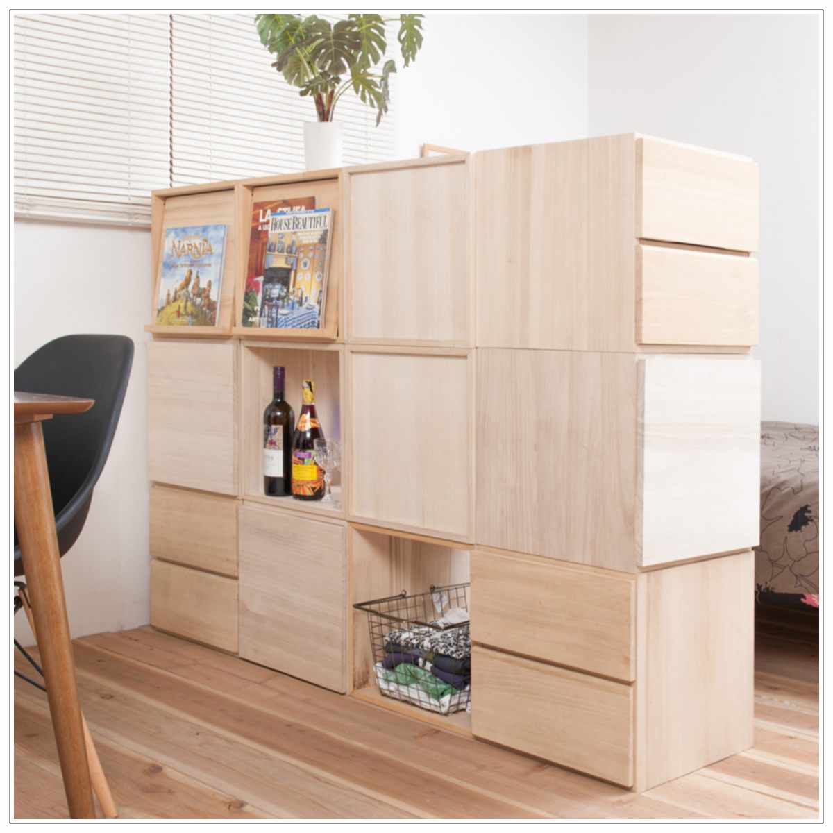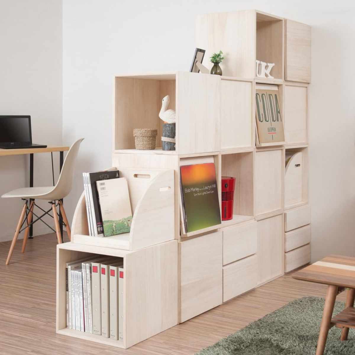 レイアウト自由なキューブ型ユニットボックスなので、組み合わせ次第で自分だけのオリジナル空間をつくることができます。背面も化粧仕上げがされているので、どの向きに置いても美しく、間仕切りとしても使うことができます。
