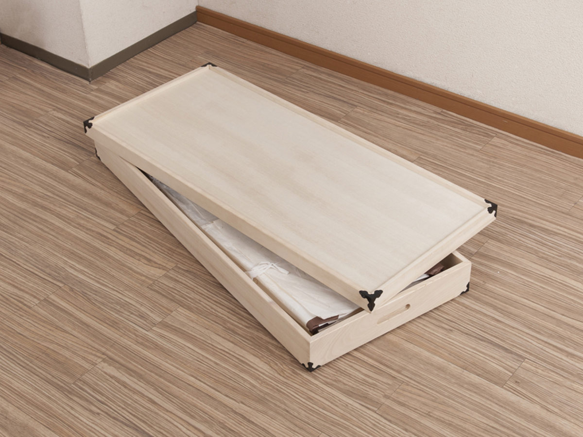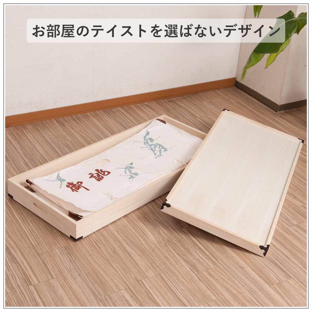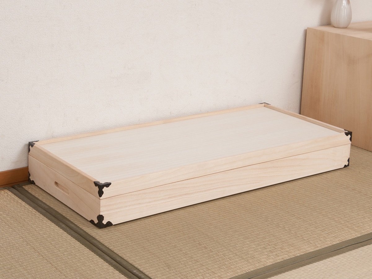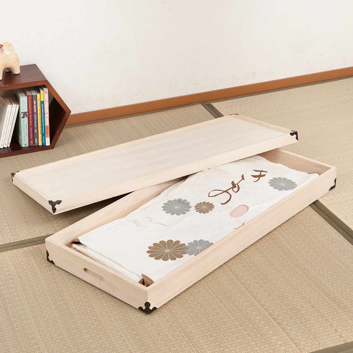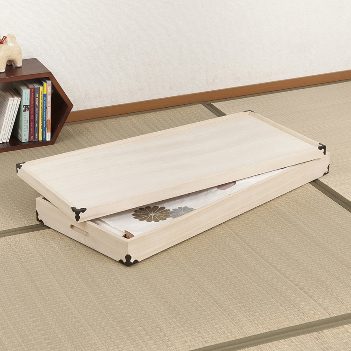 着物や浴衣の収納に定番の桐衣装箱ですが、和洋幅広いシーンにスッと馴染むナチュラルな色合いです。クローゼット上やベッド下などにすっきりと収まるのでスペースの有効活用ができます。