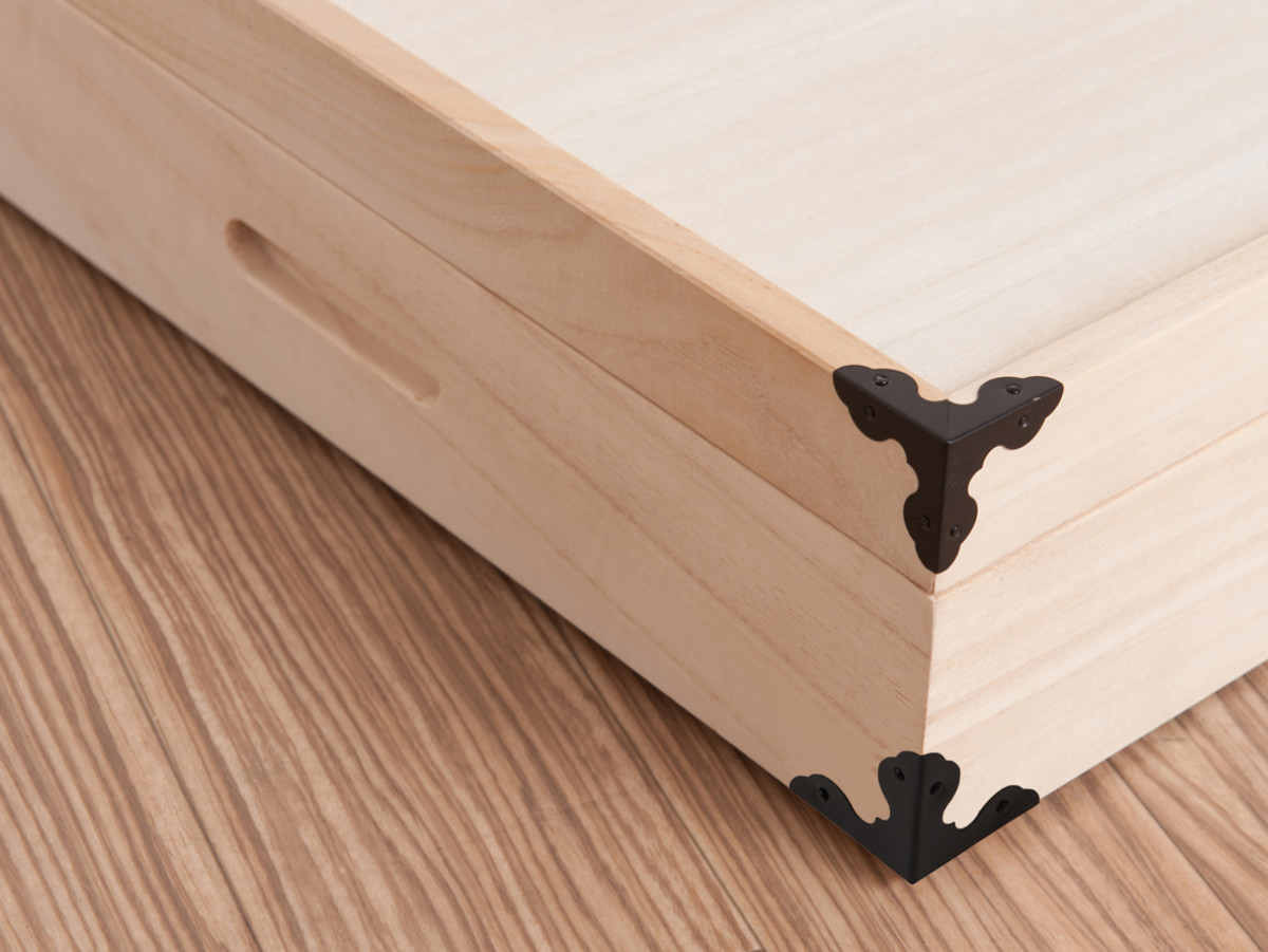 隅には補強の役割も担っている金属製の飾り金具が付いています。細部に至るまで丁寧に仕上げた逸品を長くお楽しみください。