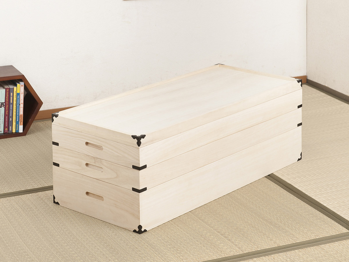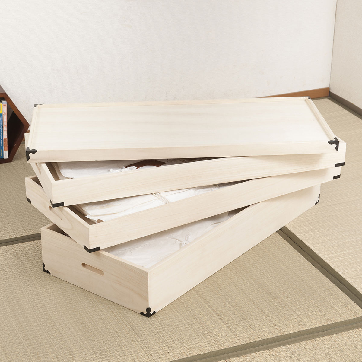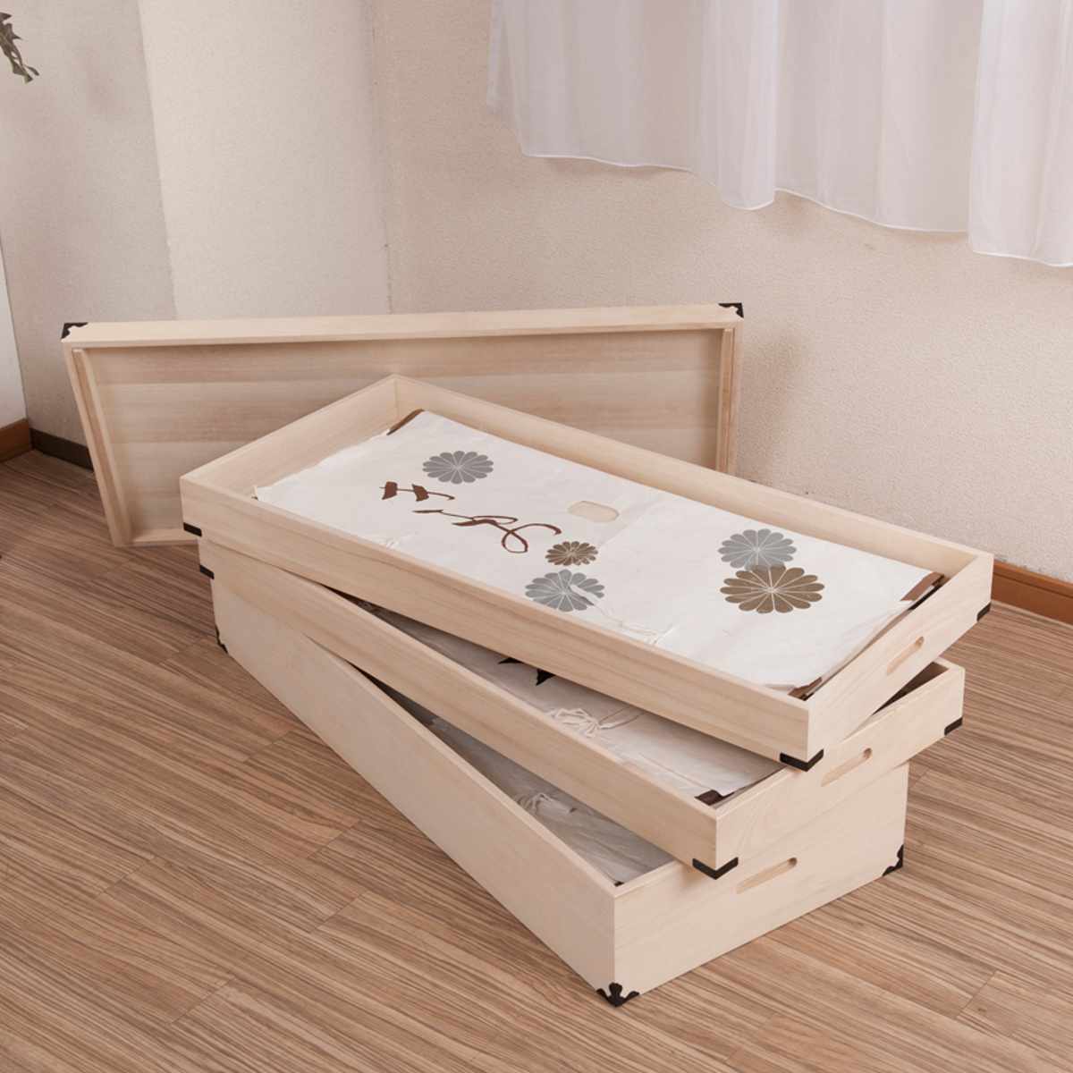 着物や浴衣の収納に定番の桐衣装箱ですが、和洋幅広いシーンにスッと馴染むナチュラルな色合いです。クローゼット上やベッド下などにすっきりと収まるのでスペースの有効活用ができます。