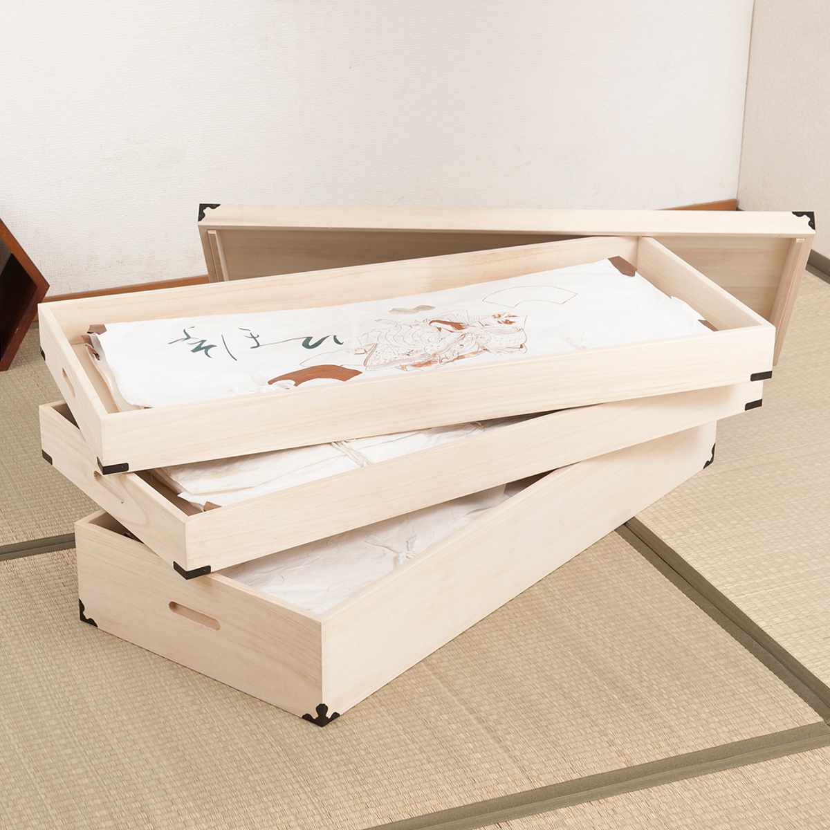 ひとつひとつ丁寧に造り上げた桐衣装箱は、繊細さと高級感を兼ね備えた逸品です。桐材は内部を一定の湿度に保とうとする働きがあるので、大切な着物や洋服などを湿気から守ってくれます。他にも、湿気を嫌う掛け軸や写真、小物類の収納にもおすすめです。