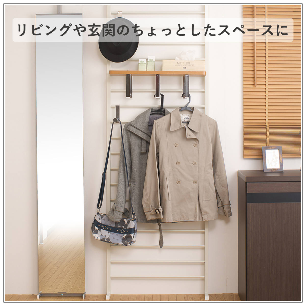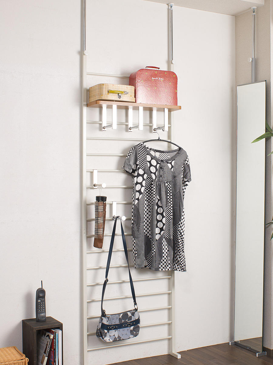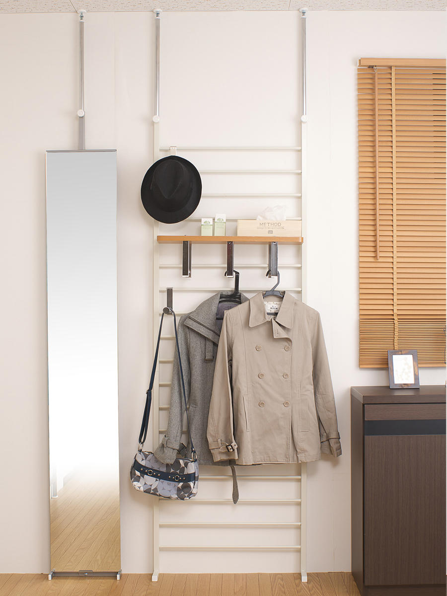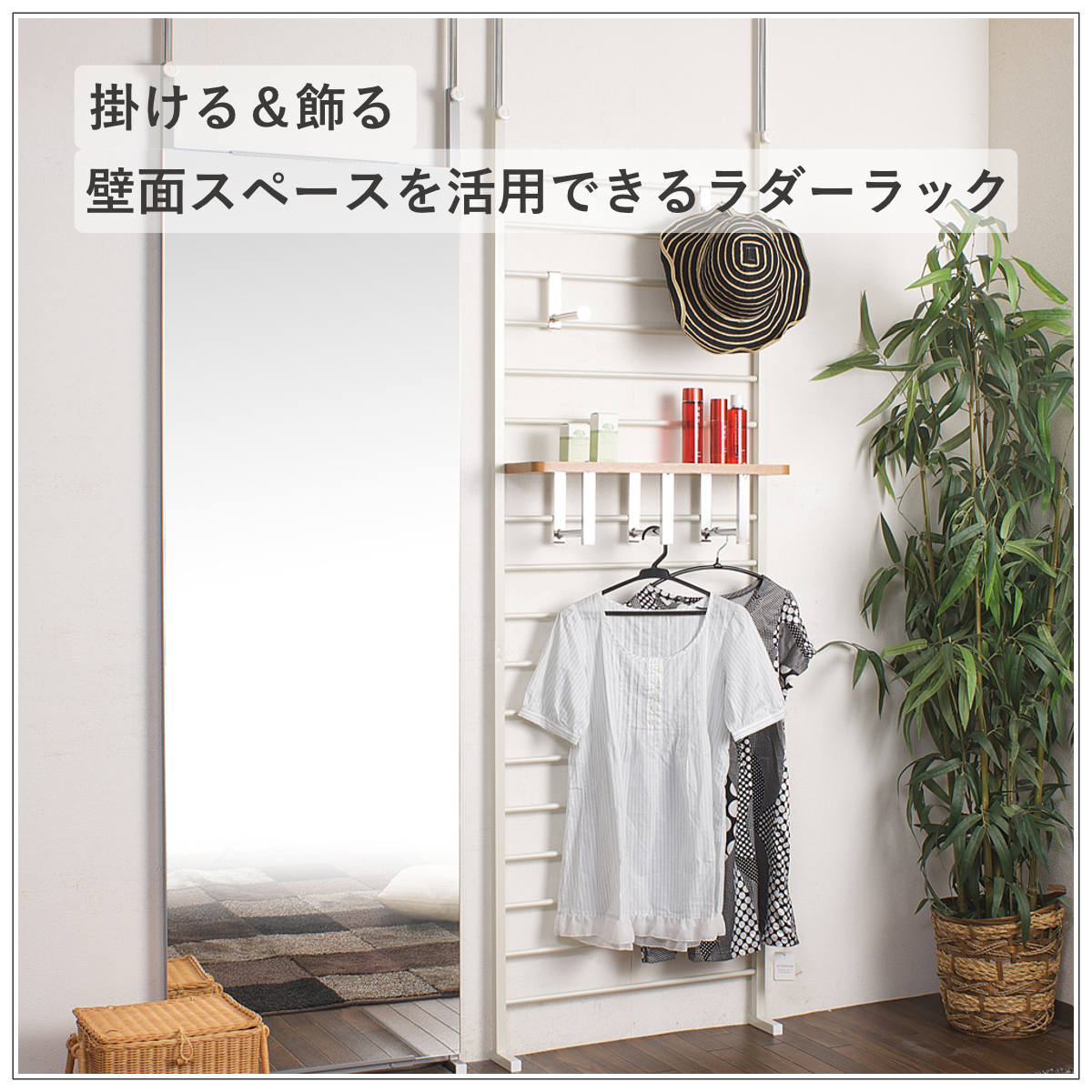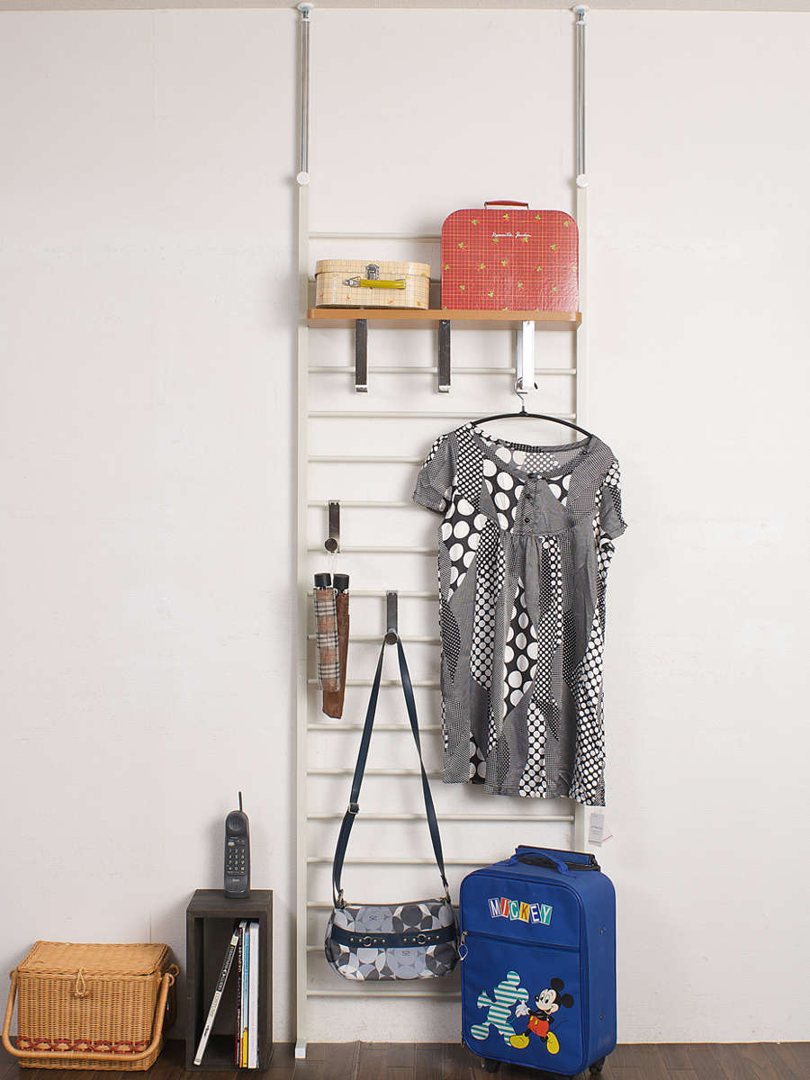 ちょっとした壁面スペースに突っ張り式で簡単に設置できるラダーラックです。掛けると飾る、どちらも楽しみながら収納できるので、インテリアのアクセントにも。天井や壁に穴を空けるなどの工事が不要なので、賃貸住宅にお住まいの方にもおすすめです。