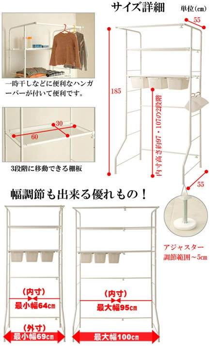 | サイズ | 約 幅69~100×奥行55×高さ185(cm) 棚板:約 幅60×奥行30(cm) 洗濯機収納内寸:約 幅64~95×高さ97・高さ107(cm) |