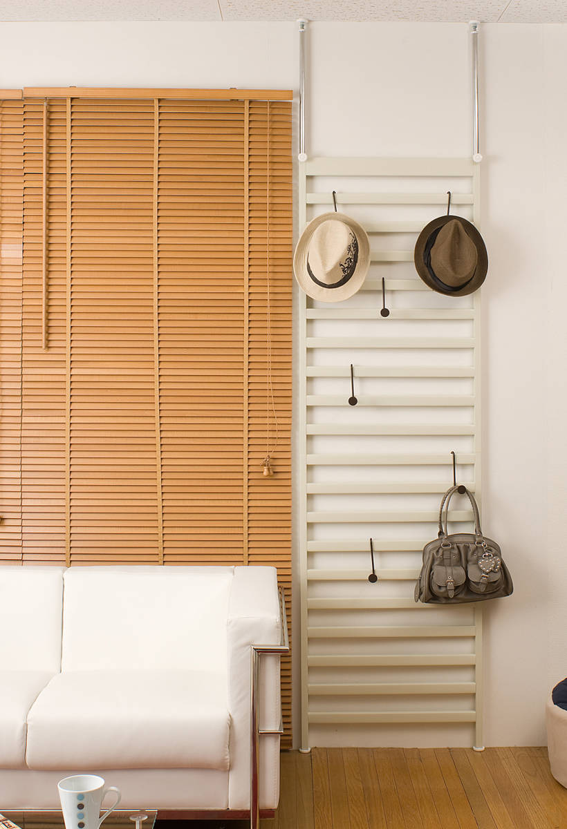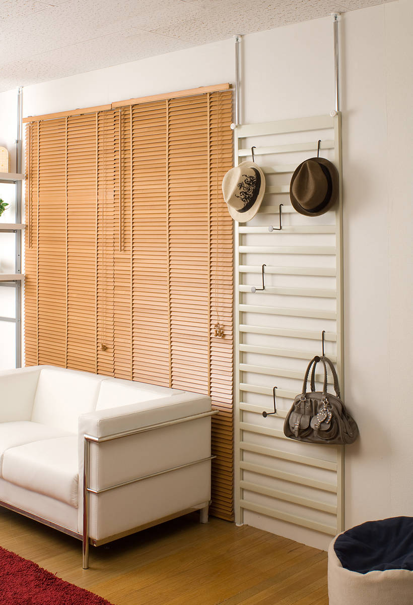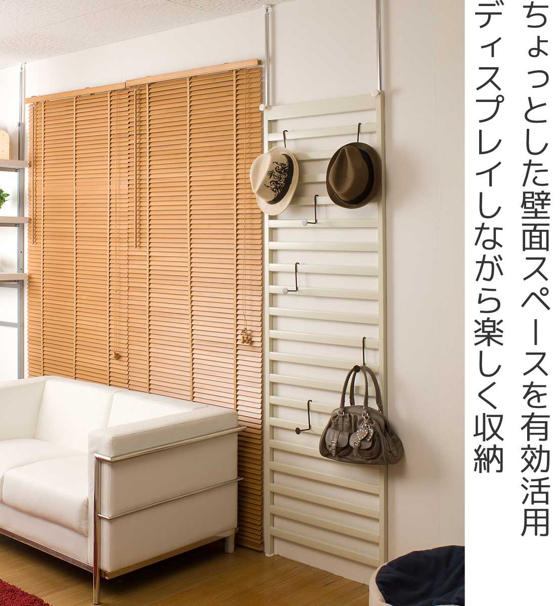 シンプルなのに機能が充実したラダーラック 幅60cmタイプです。ちょっとした壁面スペースにつっぱり式で簡単に設置できます。ディスプレイを楽しみながら収納でき、インテリアのアクセントにもなります。壁に穴を空けないので賃貸やワンルームにもおすすめです。