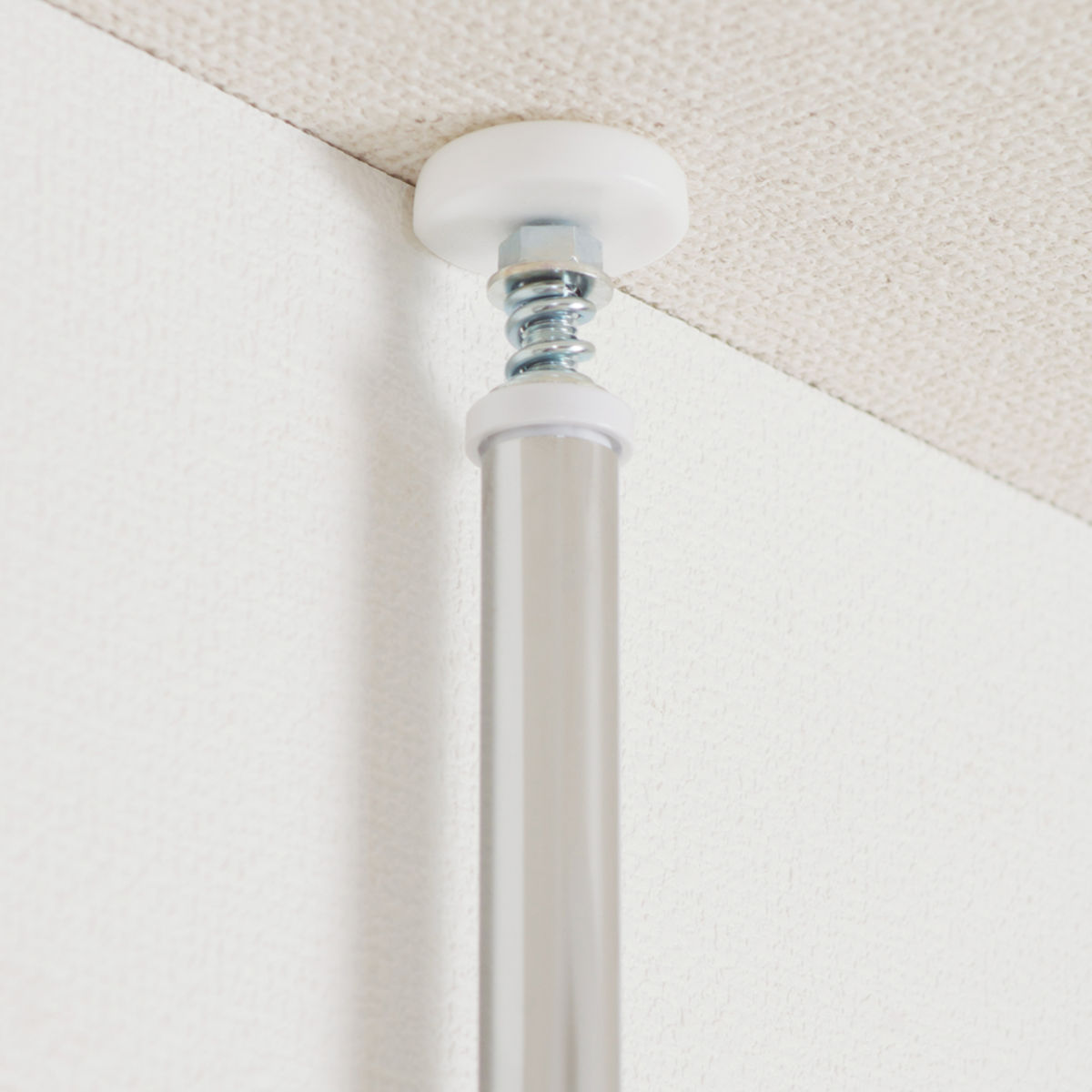 | 簡単に設置できるつっぱり式 <STEP1> 本体からパイプを伸ばして天井に突っ張り、調節つまみでしっかりと固定します。 | <STEP2> 付属のスパナを使って突っ張りアジャスターのナット部分をまわして強く固定します。 |