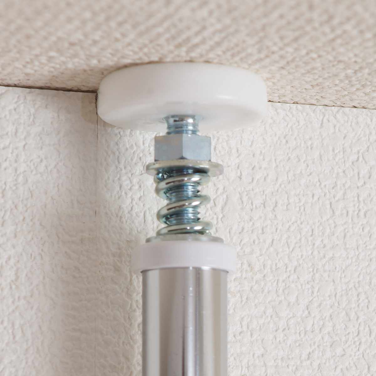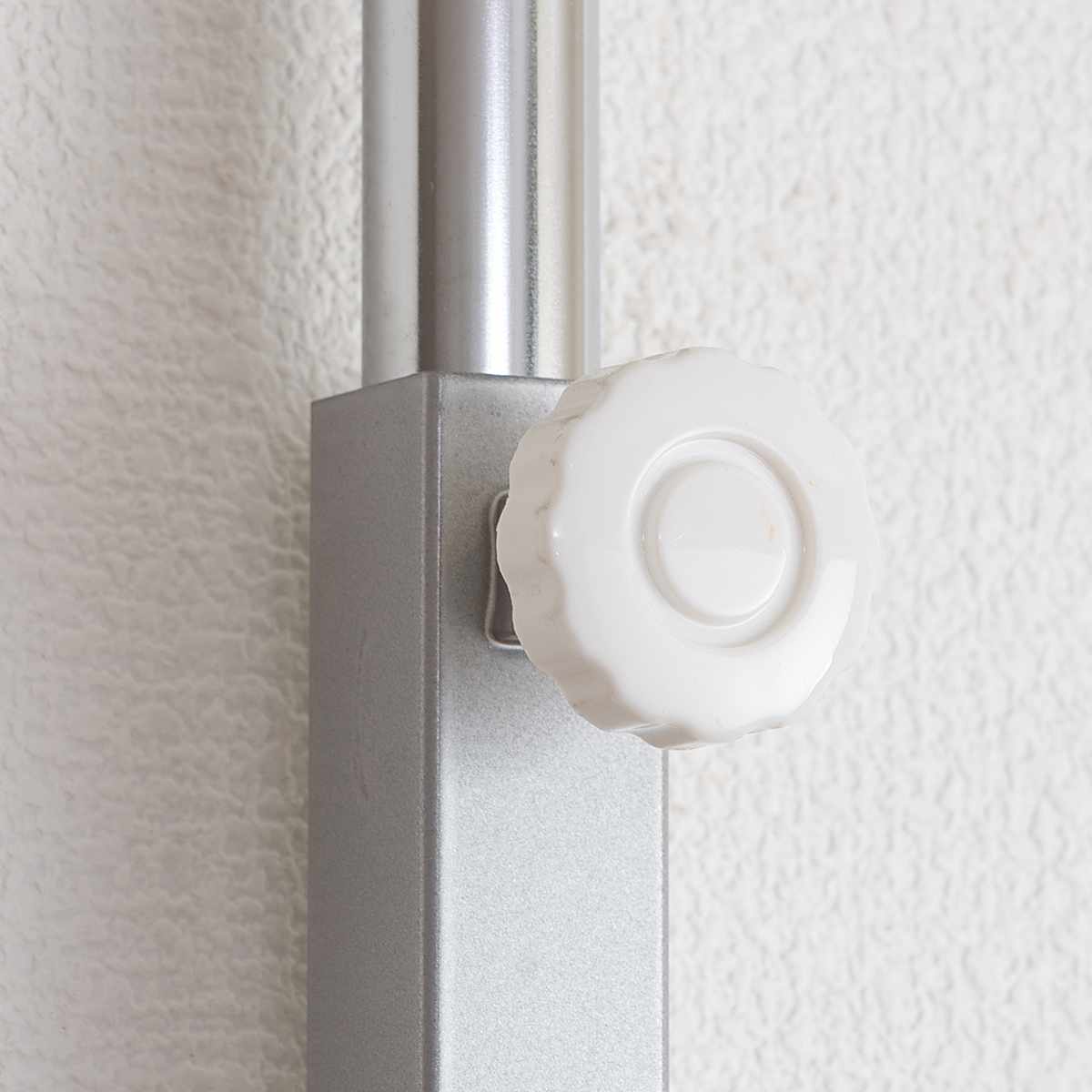 | <STEP1> 本体からパイプを伸ばして天井に突っ張り、調節つまみでしっかりと固定します。 | <STEP2> 付属のスパナを使って突っ張りアジャスターのナット部分をまわして強く固定します。 |