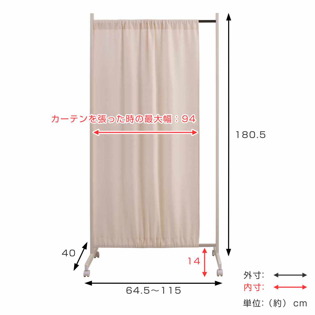 | サイズ | 本体:幅64.5~115×奥行40×高さ180.5cm カーテン最大伸張時本体幅:幅94cm 下空間部高さ:14cm |