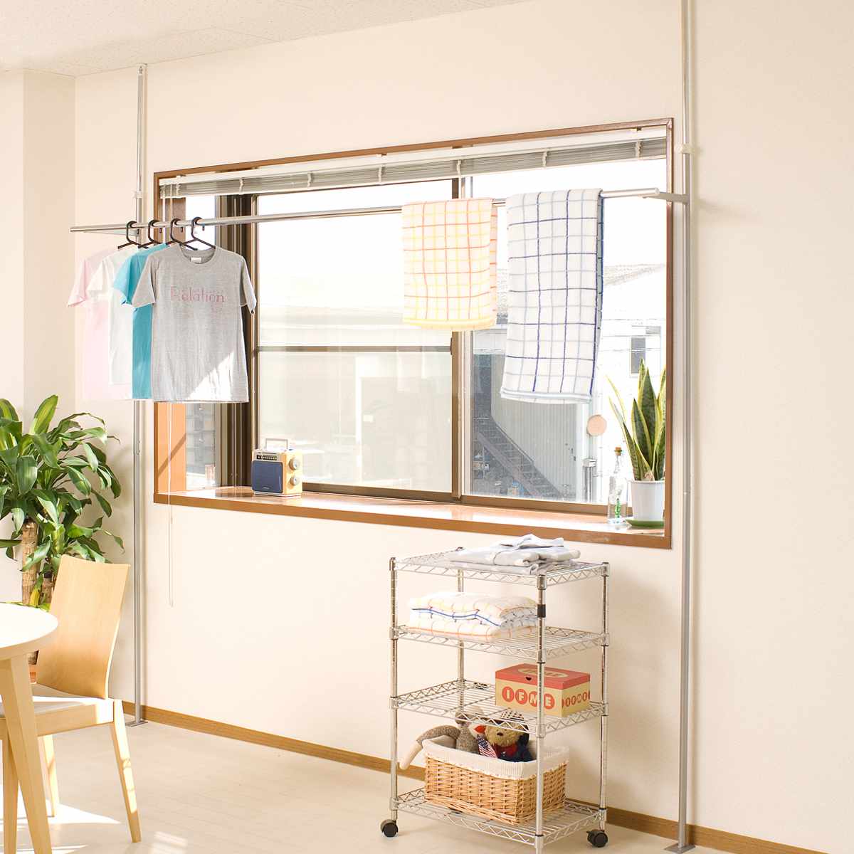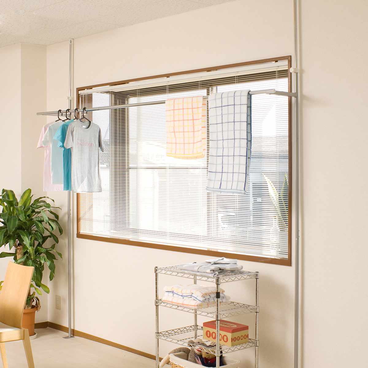 突っ張り式の室内用物干しハンガーです。窓際にも設置できるので、太陽の光をしっかり取り込みながら、お部屋の中でも効率よく洗濯物を乾かせます。ベランダがないお部屋や、花粉・黄砂が気になる季節、雨の日にも大活躍。外に干したくない下着類も安心して干すことができます。